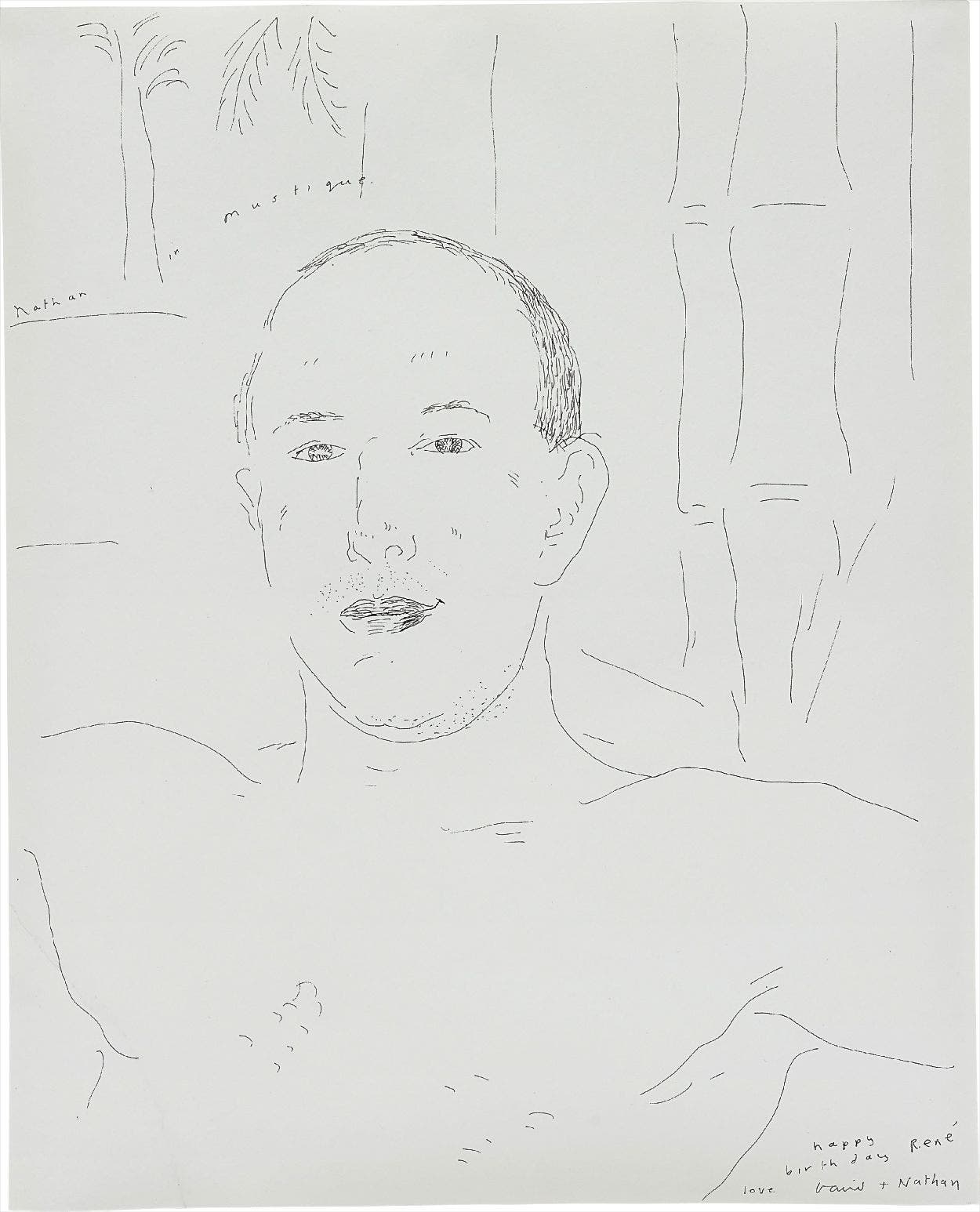 Titled "Nathan in Mustique" upper right. Further dedicated 'happy birthday René, love, David + Nathan' lower right.