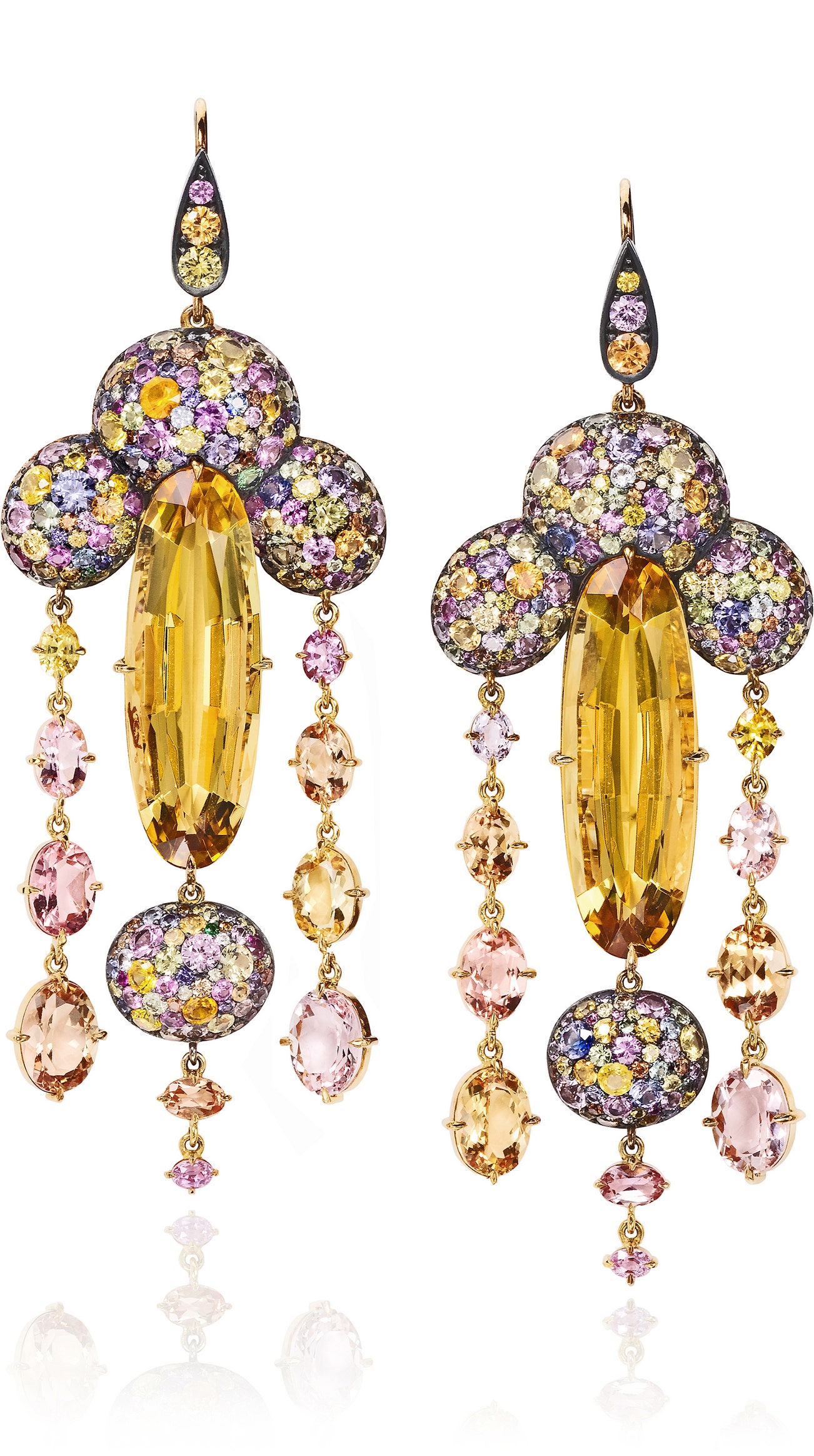 Each set with an elongated oval heliodor beryl, accented by oval sapphires, topazes, tourmalines, morganites, surmounted by bombé motifs pavé-set with colored diamonds, garnets and colored sapphires, mounted in 18k yellow gold and blackened silver, each signed DM, wire hook fittings, case stamped David Michael.