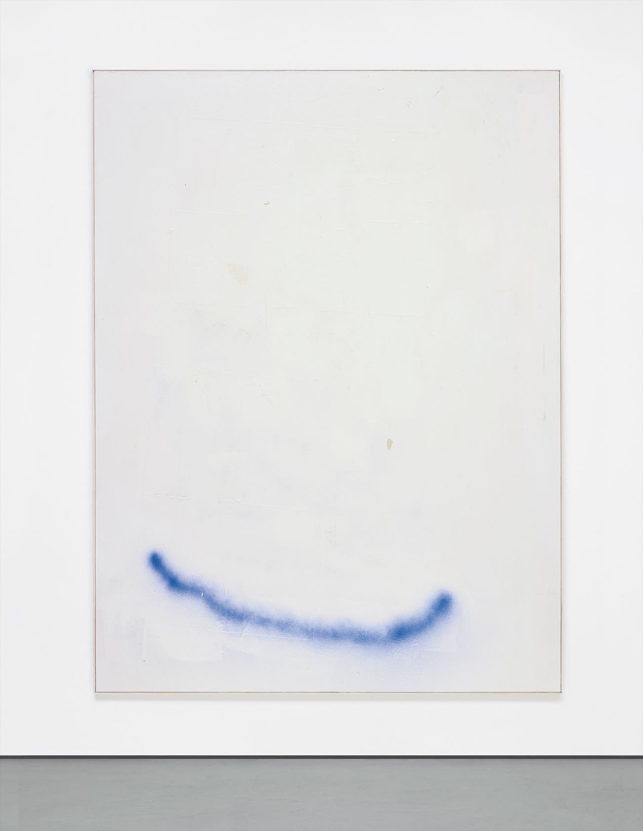 For Ostrowski, ‘F’, his favourite letter in the alphabet, also stands for Failure. For this series he strives to forget his significant artistic training in order to create an environment in which the unexpected can occur. He even attempts to use his right hand as he would his left to avoid deploying practised gestures. In the present lot a large area of thick white collage is interrupted only by a single arc of cobalt blue spray paint. Seemingly accidental marks recur rhythmically throughout his works; a streak of colour here, and a mysterious mark there. Ostrowski’s process can be described as intentionally ‘unlearnt’; undermining conventional notions of craftsmanship in painting. The artist muses on his working technique as follows, ‘I build and destroy the picture by adding and discarding canvas, colours, found fragments and dust without regard to any strategy or chronology. I strive to reduce my own decision-making power to the physicality of my actions’. As the artist seeks to discover the limits of painting and the depths of nothingness, his sparse canvases can be read as personal explorations. ‘Painting means war to me,’ Ostrowski has stated; this is an interminable undertaking, as he strives to achieve an impossible standard of beauty. His process is an ongoing struggle to disregard his artistic training and rediscover a childlike technique. In doing so he discovers more about painting and also reframes more traditional understandings of beauty. Meditative and compelling, the act of painting is stripped down to its simplest constituents: frame, canvas and paint. Some critics have described Ostrowski’s working practice as being akin to literary free association. Where he employs simplicity on a visual level, Ostrowski integrates carefully chosen wordplays into the titles of his works, introducing an element of witty subterfuge that deliberately hinders our interpretation.