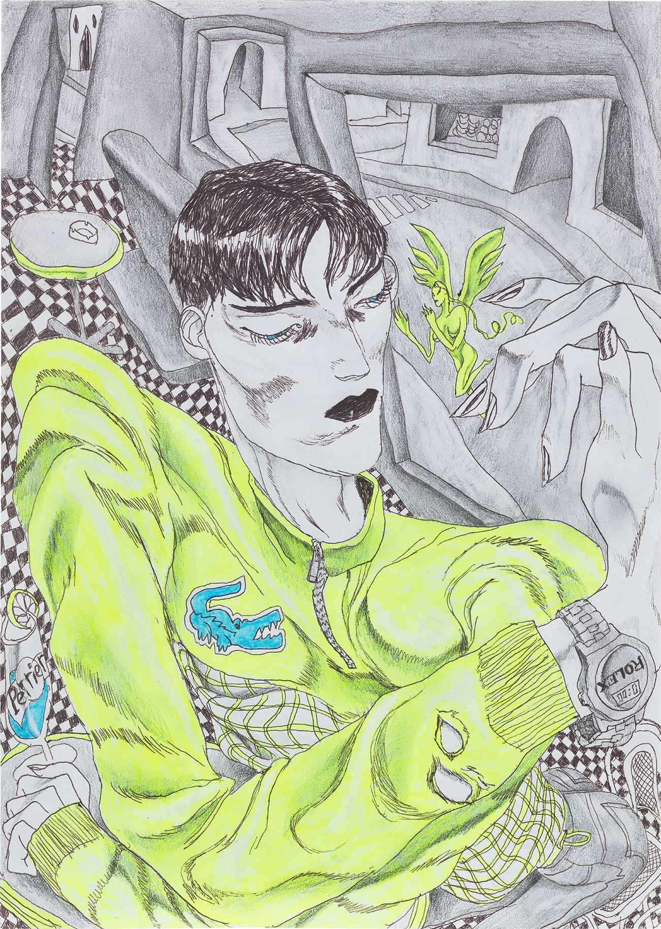 ballpoint pen, pencil, charcoal pencil, fluorescent marker and acrylic on paper