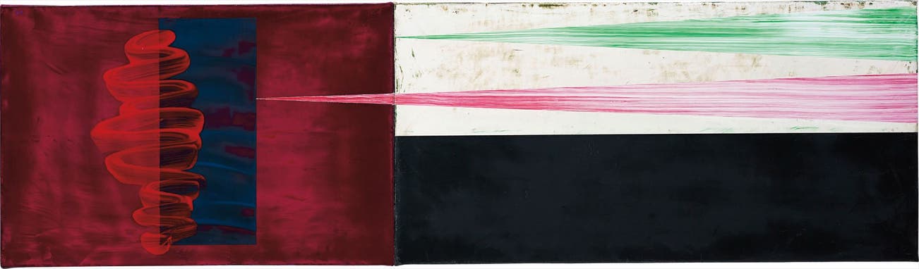 Signed, titled, inscribed and dated 'DAVID REED 180-2 1981-83 ANOTHER! THAT FAMILIAR SELF.' on the overlap and reverse.
