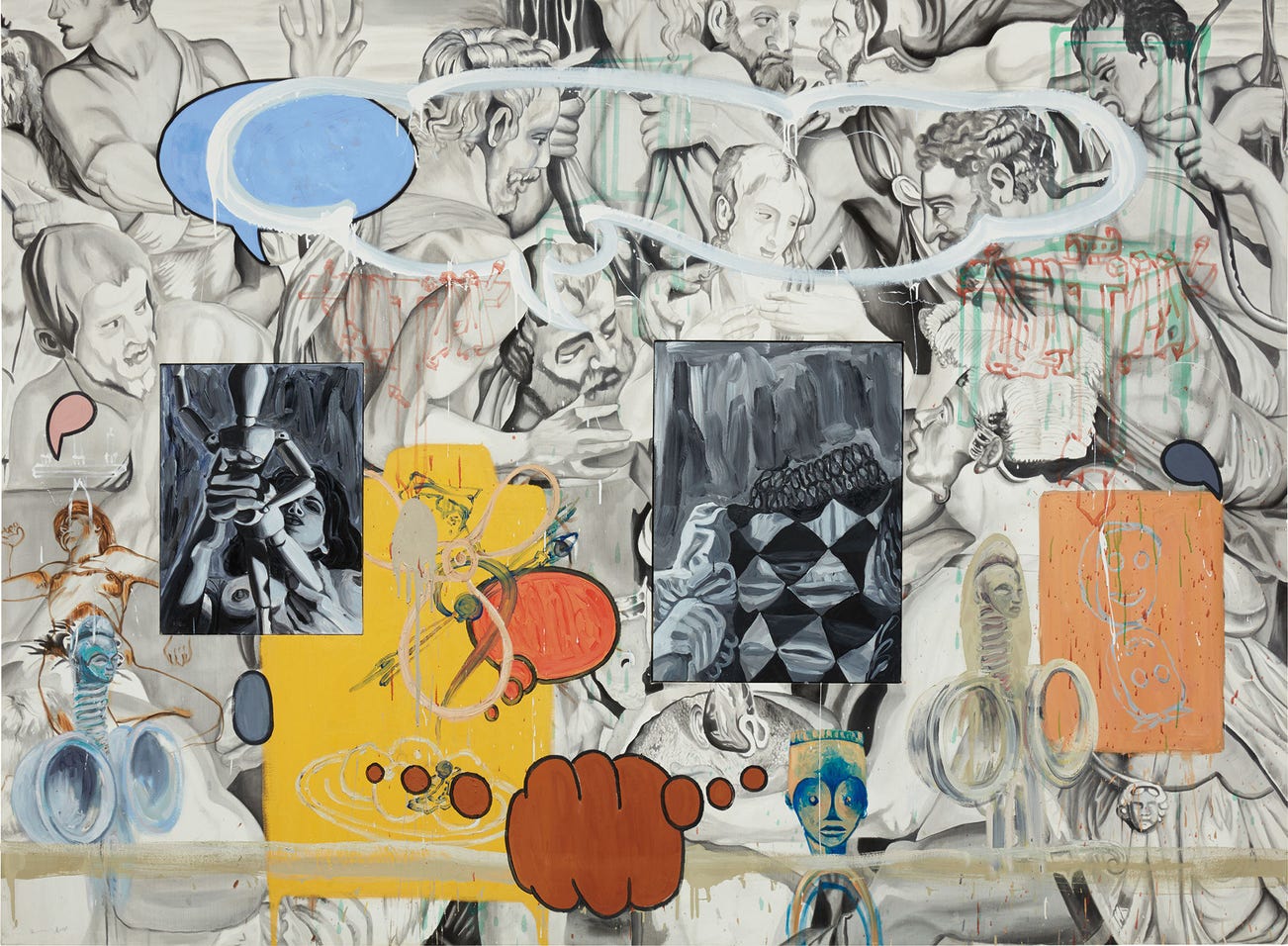 While the grand scale of the canvas references the monumental proportions of historical tapestries, the cacophony of motifs eschews the narrative tendencies inherent to their source material. Emerging from the embroidered grey background, the conglomerate of visual cues provides endless points of entry, inviting the viewer into the fabric of the painting. Weaving through the composition, the viewer discovers African masks, phallic forms, and outlines of chairs and a fan. A pair of smaller canvases are set within the composition – their emphasis of light and shadow reminding the viewer that their subjects derive from black-and-white photographs. One of a nude, dark haired woman holding a wooden mannequin and the other of a headless harlequin, the grisaille renderings appear as windows into private worlds – intimate snapshots, quietly existing within the larger composition. Blue and orange speech bubbles hover in the foreground, teasing at a train of thought. As the viewer attempts to decipher the link between the collaged images, the emptiness of the speech bubbles thwarts any narrative conclusions.