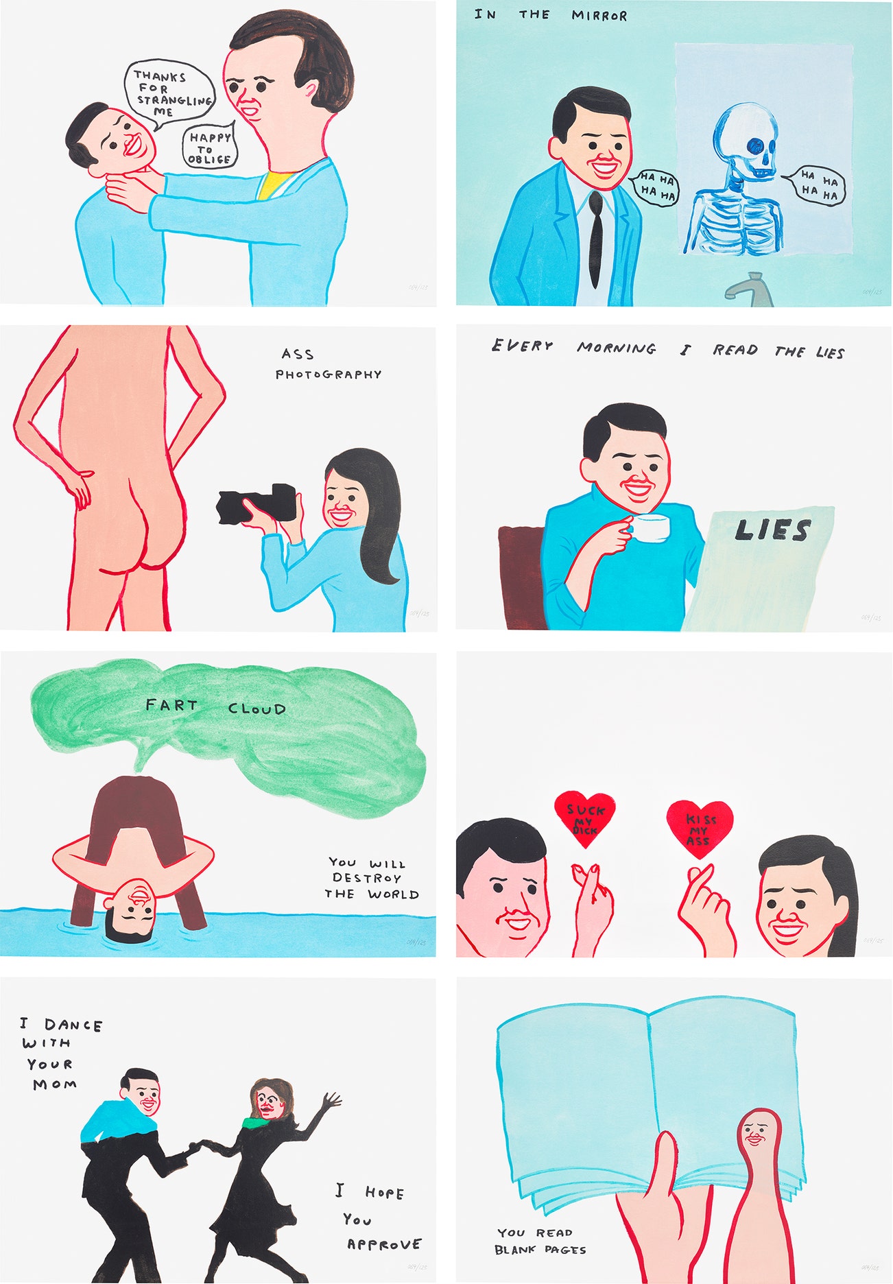 Including Thanks for Strangling Me; In The Mirror; Ass Photography; Every Morning I Read The Lies; Fart Cloud, You Will Destroy The World; Kiss My Ass; I Dance With Your Mom, I Hope You Approve; and You Read Blank Pages.