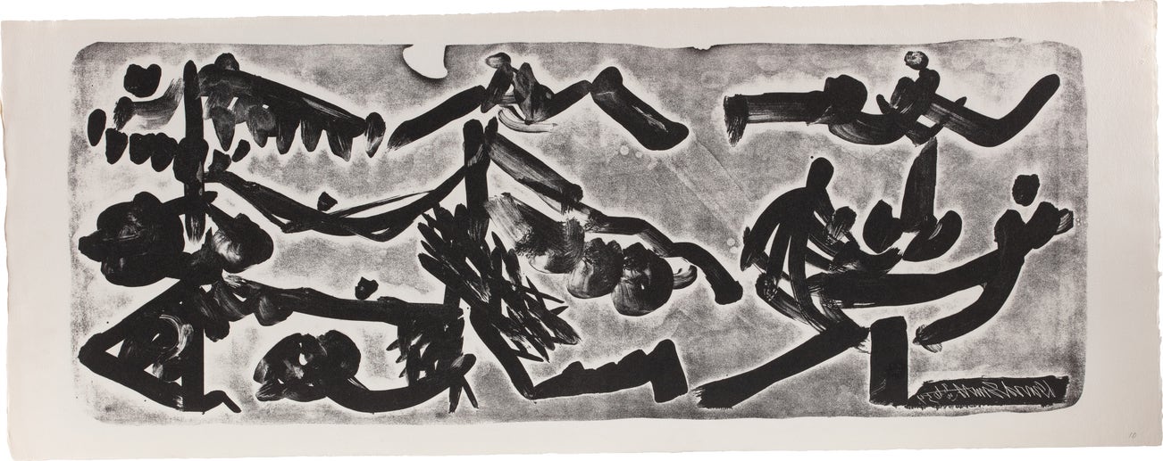 In 1954 David Smith was a visiting artist at the University of Mississippi where printer Reginald Neal was chairman of the art department. Smith and Neal worked together making an edition of the first state of this lithograph, and afterwards Smith asked Neal to add some background tone to the image. Neal resensitized the stone and inked its surface with a roller. The 'halos' which appear around Smith's calligraphic brushwork in the second state resulted from ink deposits left from the first state preventing the roller from hitting the stone. According to Neal, these 'halos' pleased Smith very much. Reginald Neal, interview, April 1985.