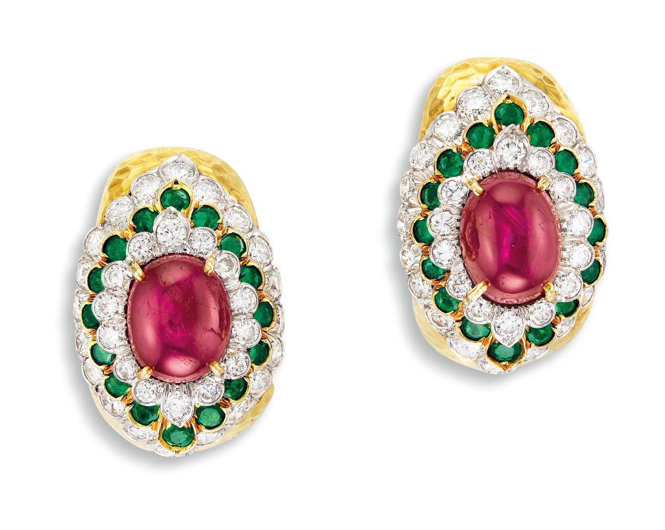 Two oval cabochon rubies, together approximately 16.00 caratsBrilliant-cut diamonds in the surround totalling approximately 4.00 caratsFurther enhanced by circular-cut emeraldsPlatinum and 18 karat white gold(Two Rubies)