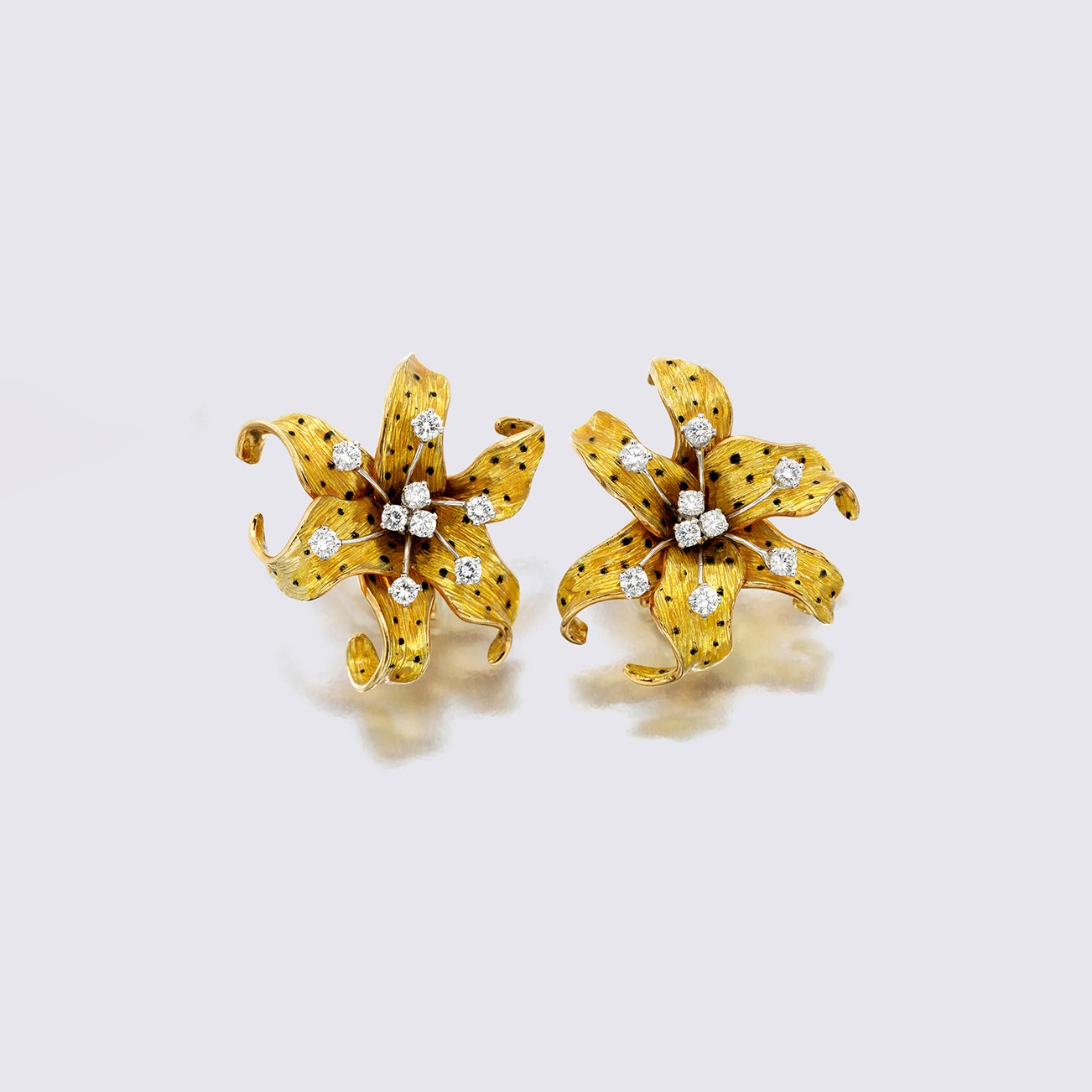 Pair of Diamond and Enamel Tiger Lily Earclips