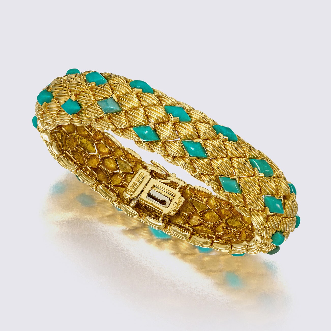 Set with marquise-shaped turquoise cabochons, mounted in 18K yellow gold, inner circumference 6 1/2 inches, signed David Webb, numbered.