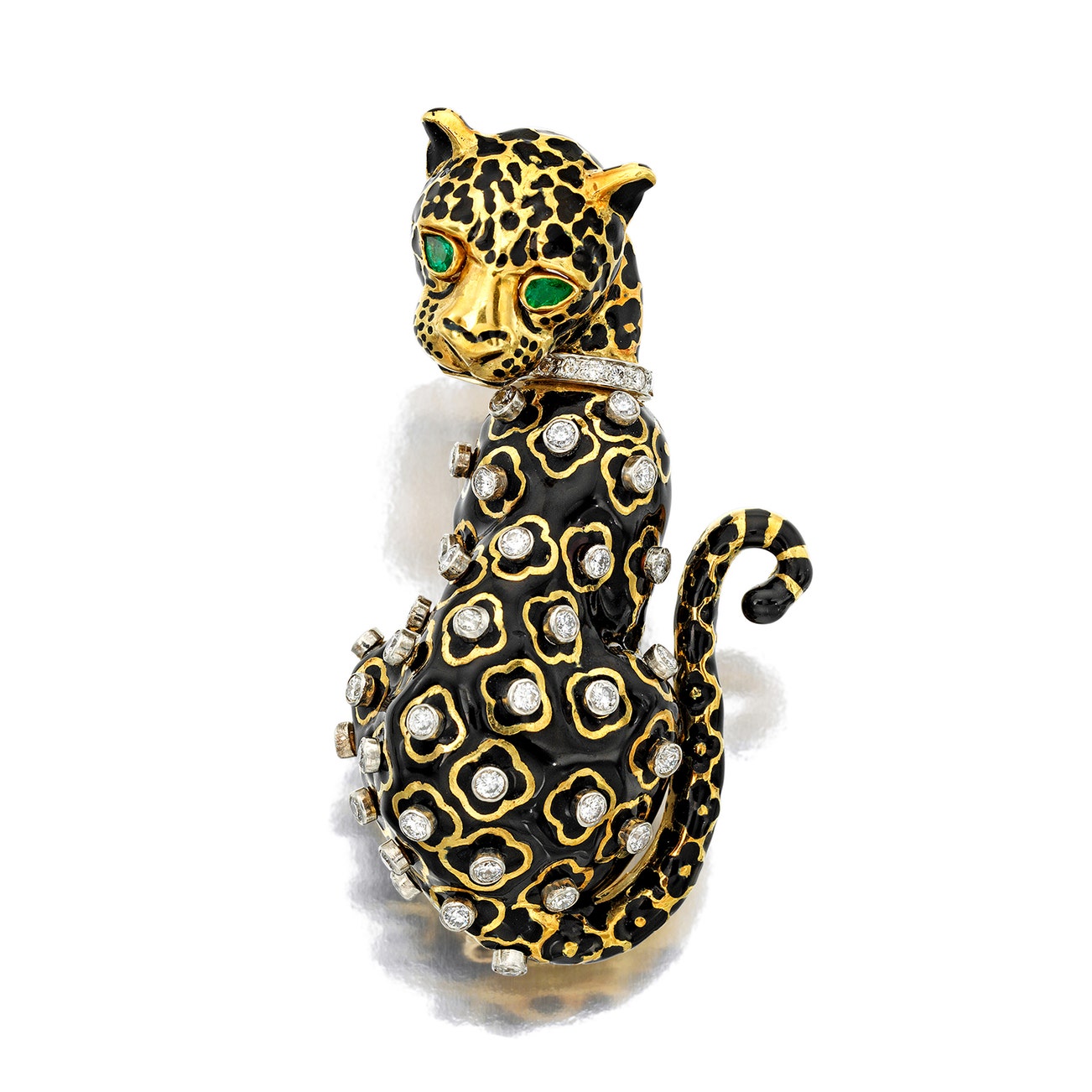 Of leopard design, set with brilliant-cut diamonds and black enamel, accented by two pear-shaped emeralds, mounted in platinum and 18K gold, length approximately 2 1/2 inches, signed Webb.