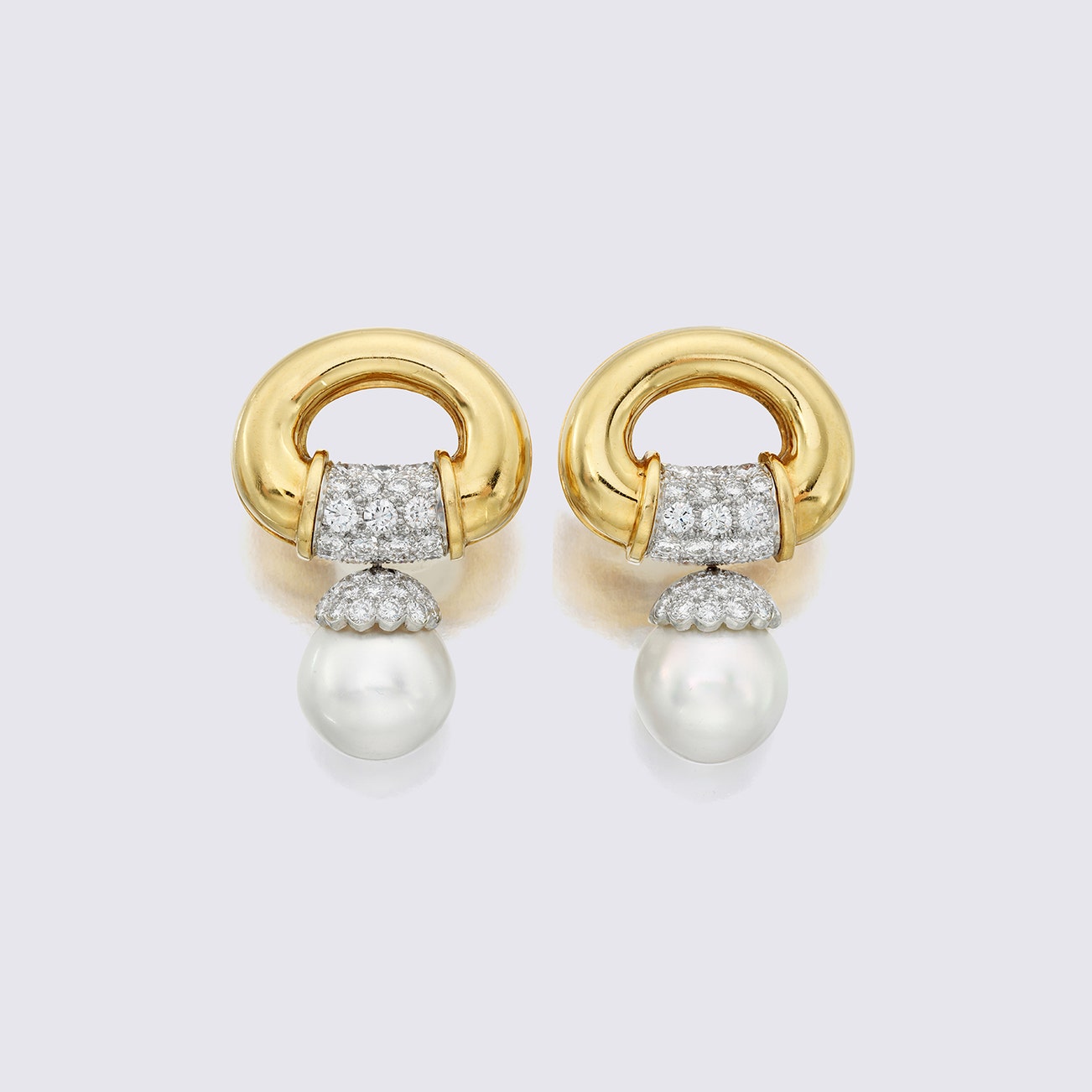 Each set with a cultured pearl drop, accented by brilliant-cut diamonds, mounted in platinum and 18K yellow gold, length approximately 1 5/8 inches, signed Webb.