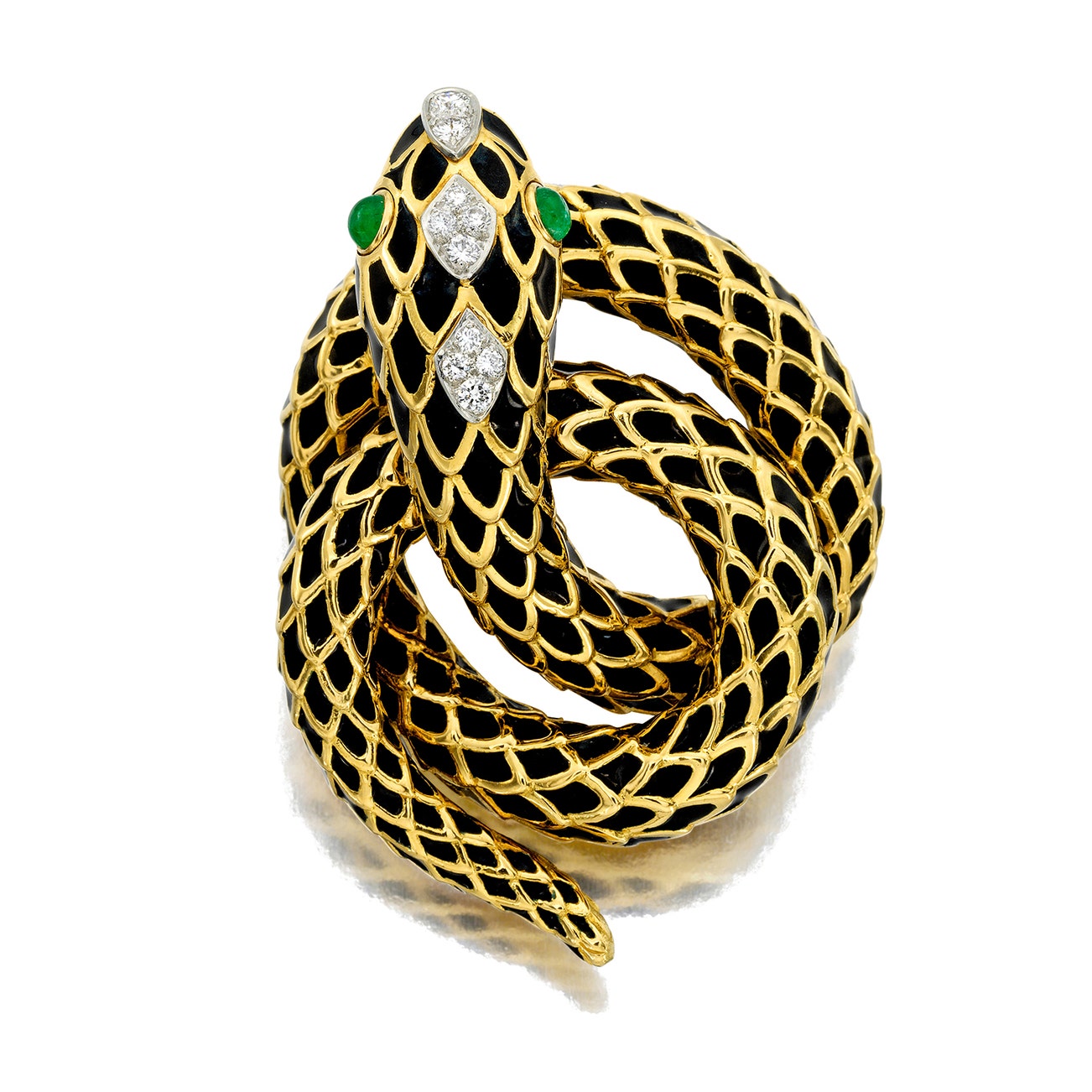 Of serpent design, set with brilliant-cut diamonds, round-shaped emerald cabochons and black enamel, mounted in platinum and 18K gold, length approximately 2 1/4 inches, signed David Webb and Webb, numbered, with maker's mark.