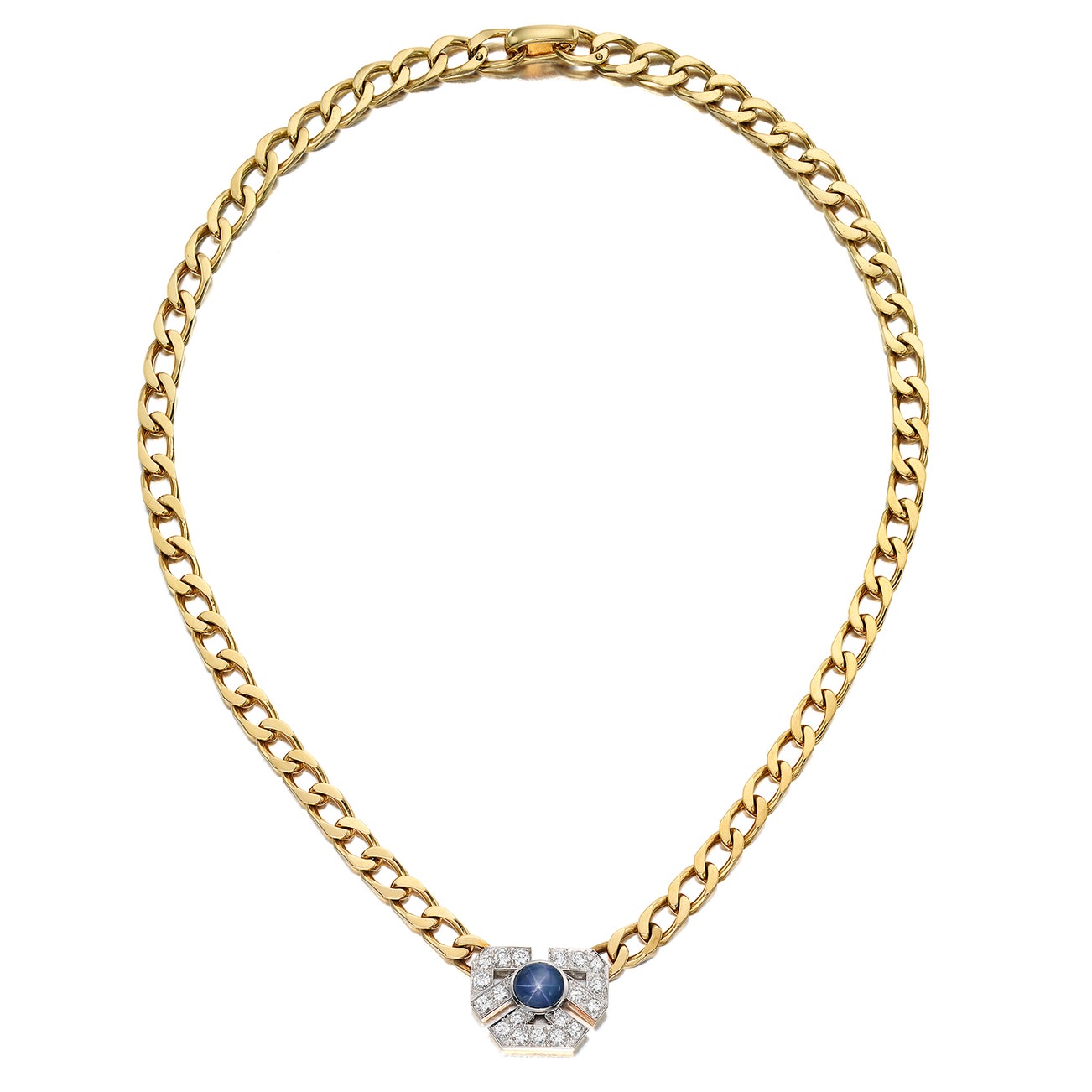 Set with an oval-shaped star sapphire cabochon, accented by brilliant-cut diamonds, mounted in platinum and 18K yellow gold, length approximately 19 inches, signed WEBB.