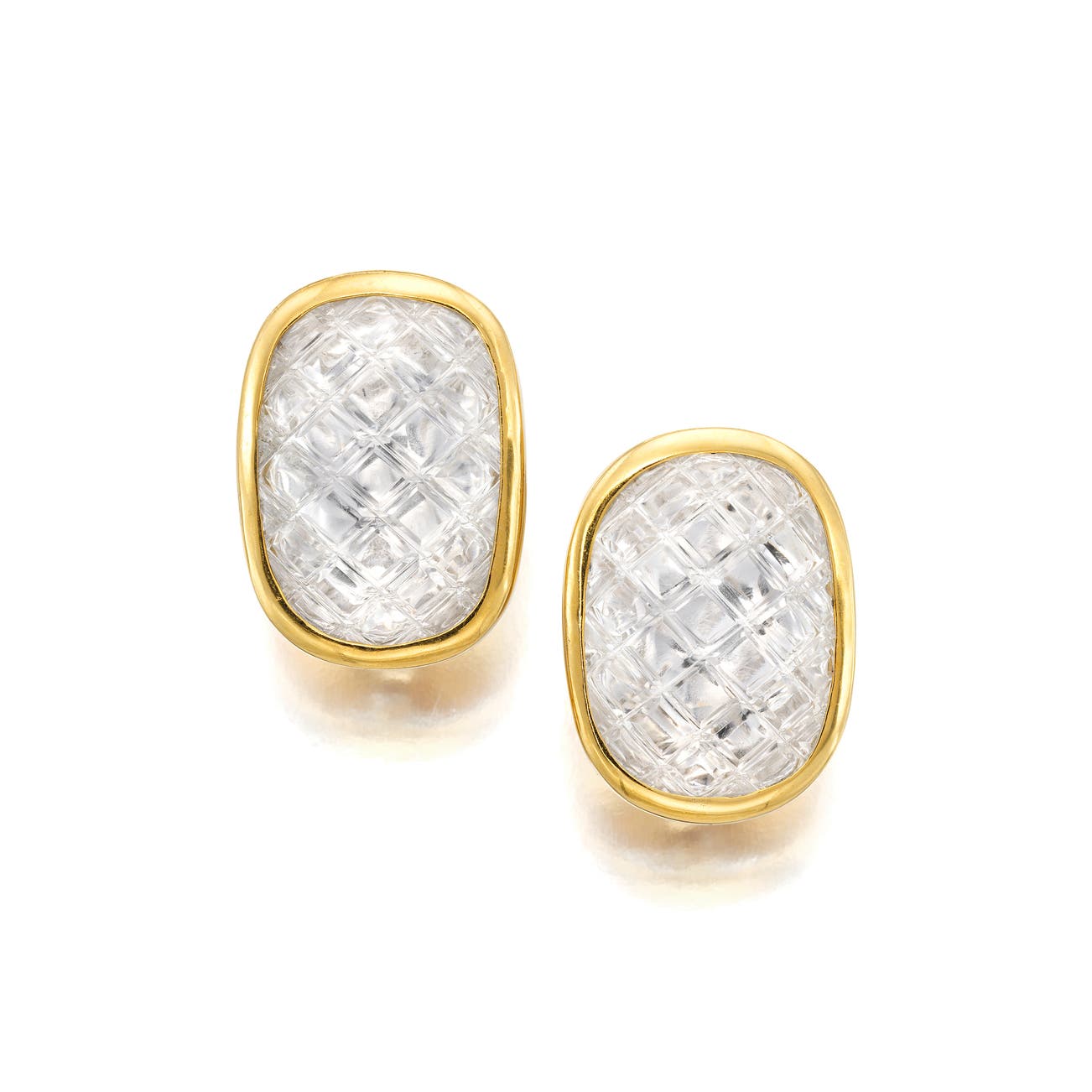 Each set with carved rock crystal in a grid pattern, mounted in 18k yellow gold, each signed Webb for David Webb, measuring approximately 1 1/8 x 7/8 inches.