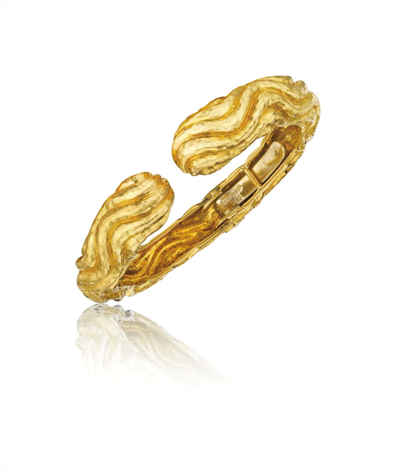 Designed as a textured gold hinged cuff, mounted in 18K yellow gold, diameter 2 1/4 inches.