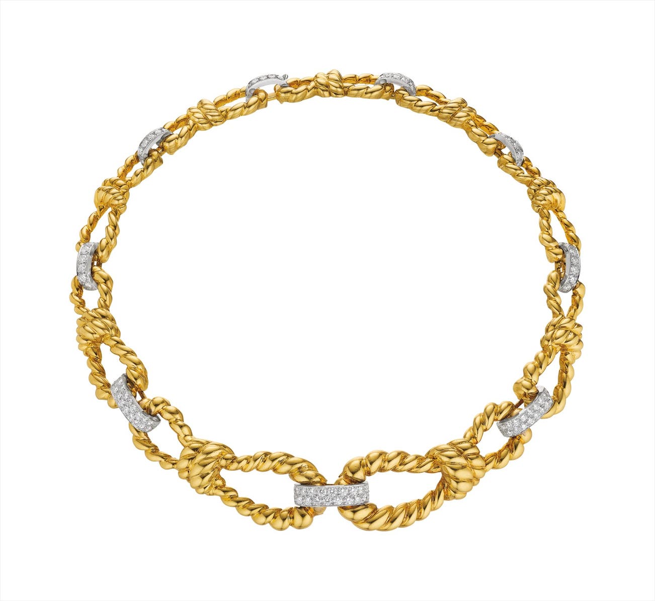 Designed as a graduated necklace, composed of polished rope-twist motif links, joined by pavé-set diamond arc-shaped links, mounted in 18K yellow gold and platinum, length 16 inches.