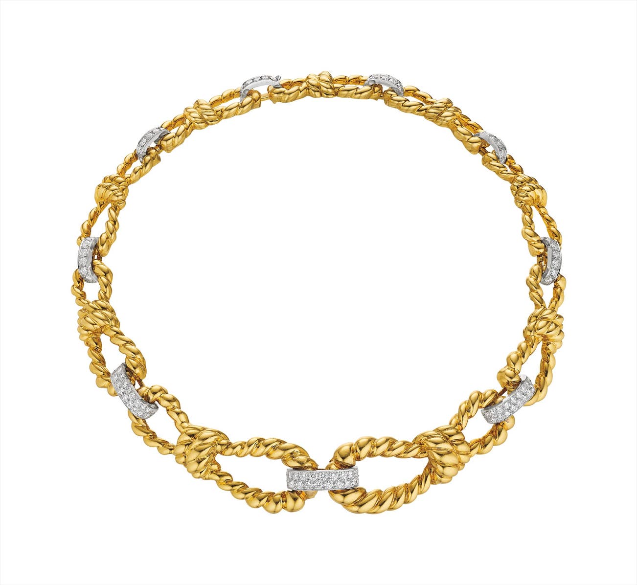 Designed as a graduated necklace, composed of polished rope-twist motif links, joined by pavé-set diamond arc-shaped links, mounted in 18K yellow gold and platinum, length 16 inches.