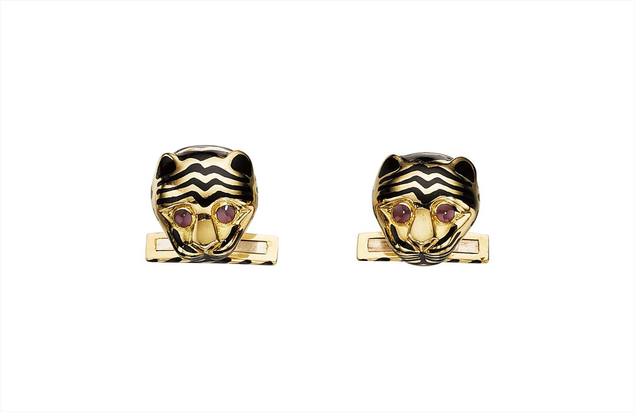 Each designed as a polished gold cheetah head, decorated with black enamel and cabochon ruby eyes, to the black enamel swivel link, mounted in 18K yellow gold, length 1 inch.