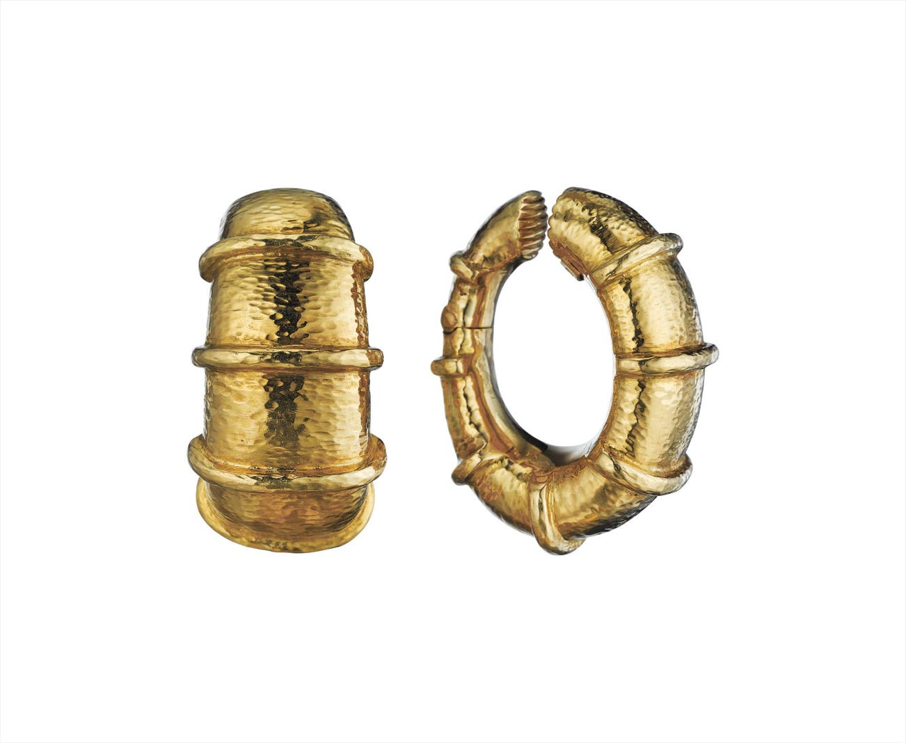 Each designed as a wide textured gold bombé hoop, mounted in 18K yellow gold, length 1 1/2 inches.