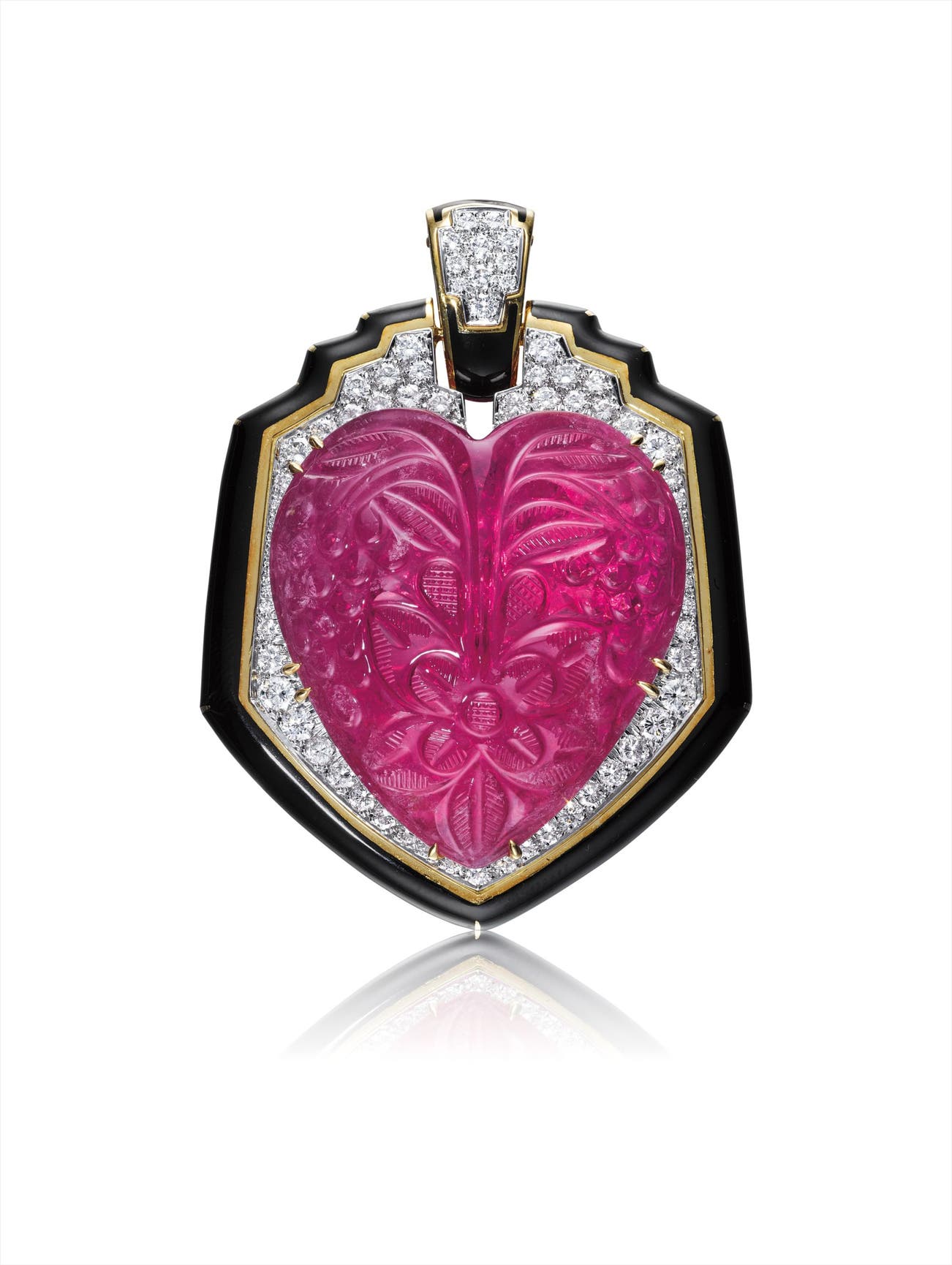 Designed as a shield-shaped pendant, centering on a floral-carved heart-shaped pink tourmaline, to the circular-cut diamond plaque framed by a polished gold border and black enamel, mounted in 18K yellow gold and platinum, length 3 inches.
