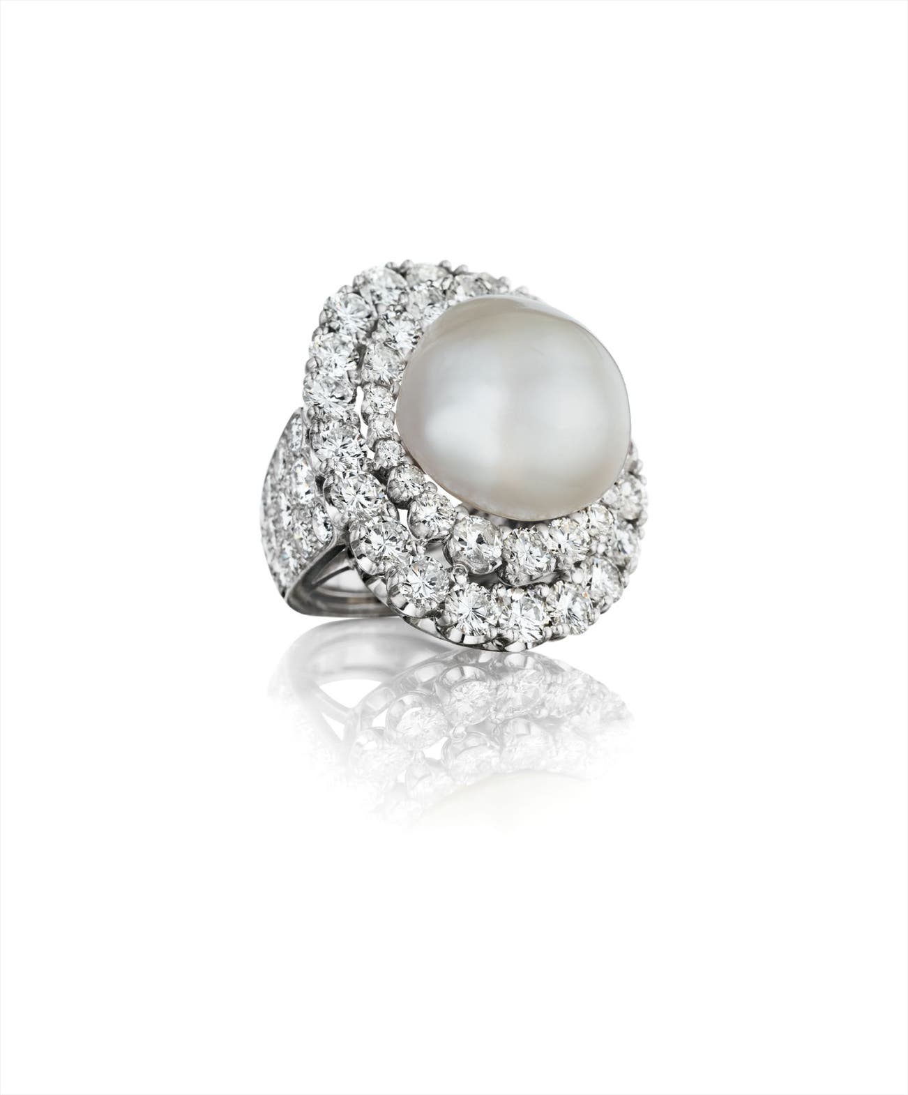 Centering on a baroque cultured pearl, to the circular-cut diamond surround and shoulders, mounted in platinum, size 4 1/2.