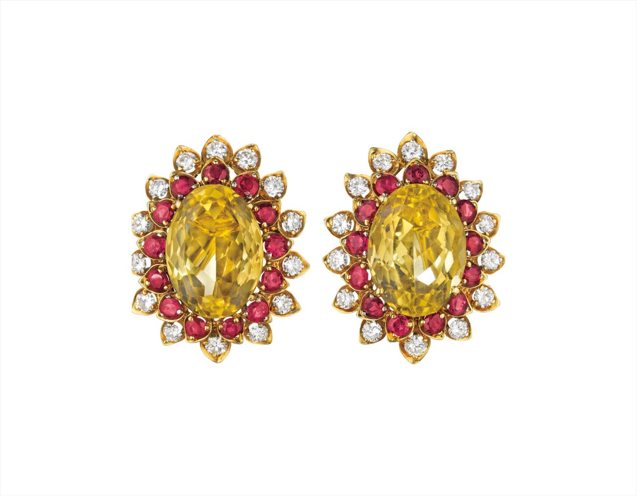 A Pair of Citrine, Ruby, and Diamond Ear Clips