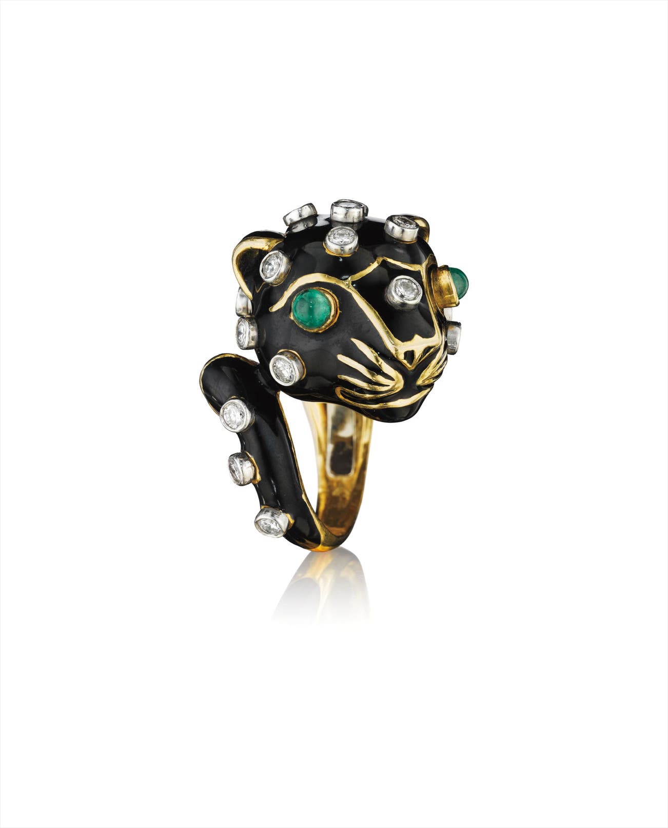 A Diamond, Emerald, and Enamel 'Panther' Ring