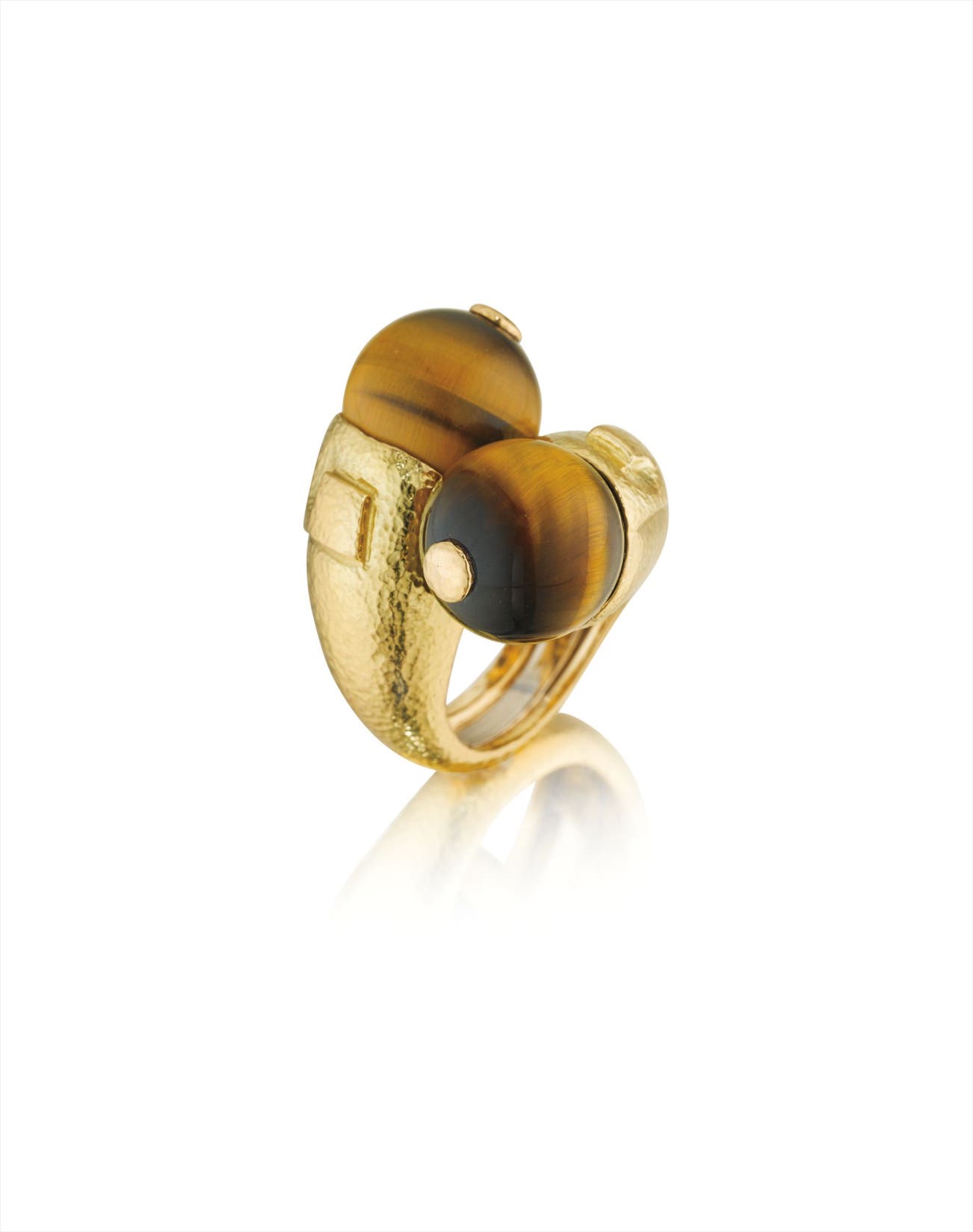 Of cross-over bombé design, the textured gold band terminating in tiger's eye spheres, enhanced by a textured gold appliqué, mounted in 18K yellow gold, size 6 1/2.