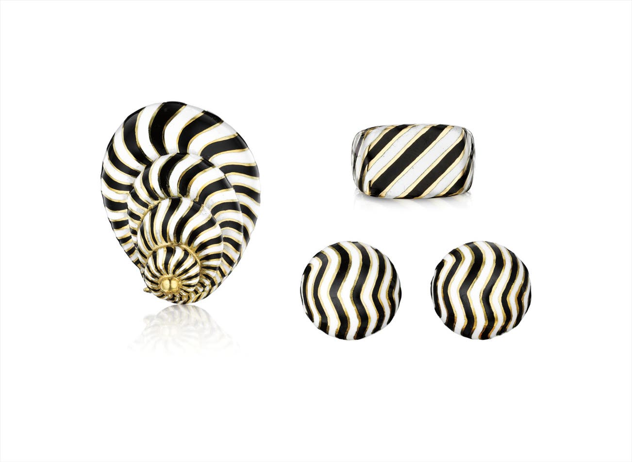 Comprising a brooch, designed as a polished gold spiral shell enhanced by black and white enamel stripes; a pair of earclips and ring en suite, mounted in 18K yellow gold, brooch length 1 3/4 inches, earclips length 3/4 inch, ring size 6.