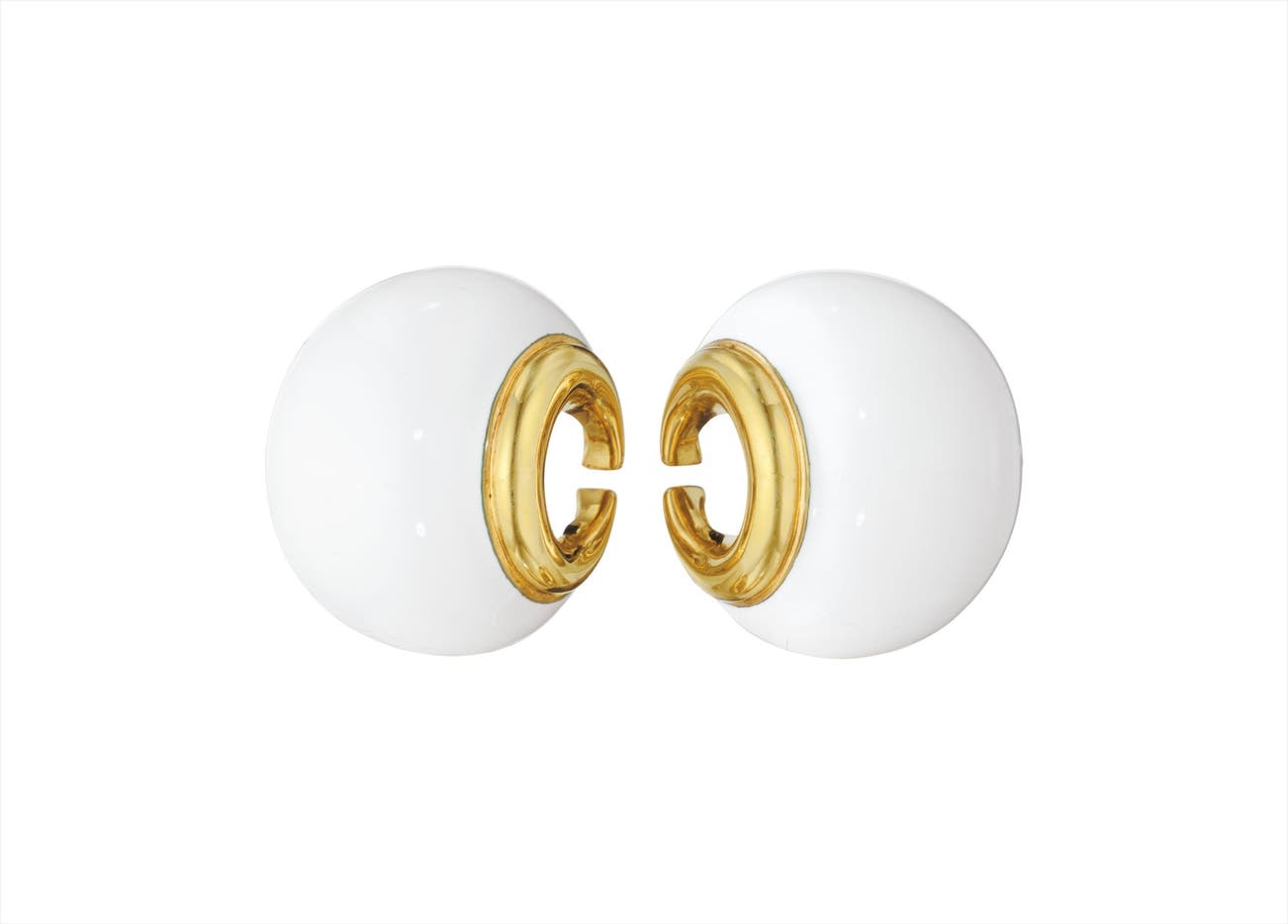 Each designed as a bombé crescent plaque decorated with white enamel, to the polished gold inner hoop border, mounted in 18K yellow gold, length 1 5/8 inches.