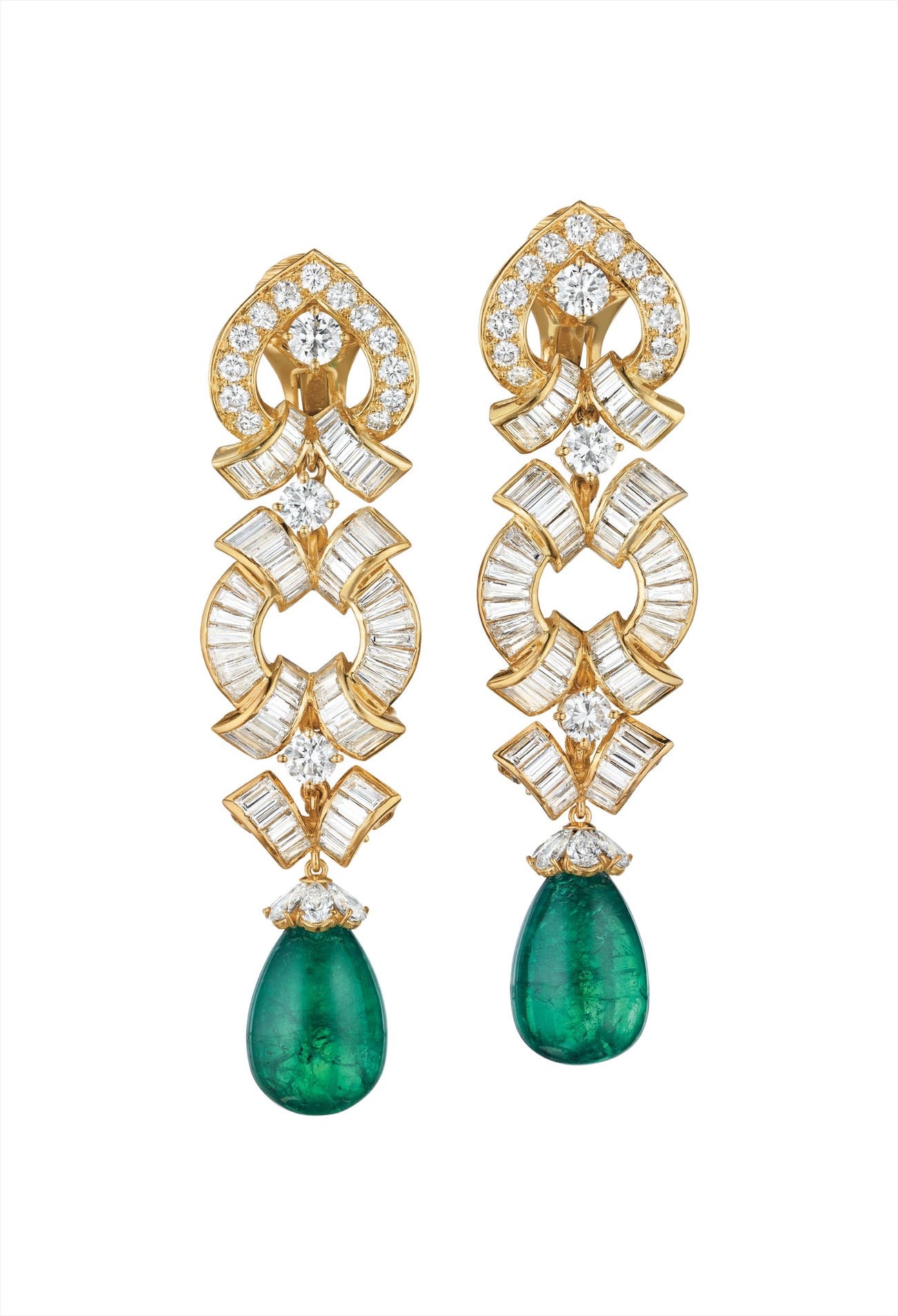 An Impressive Pair of Diamond and Emerald or Cultured Pearl Ear Pendants