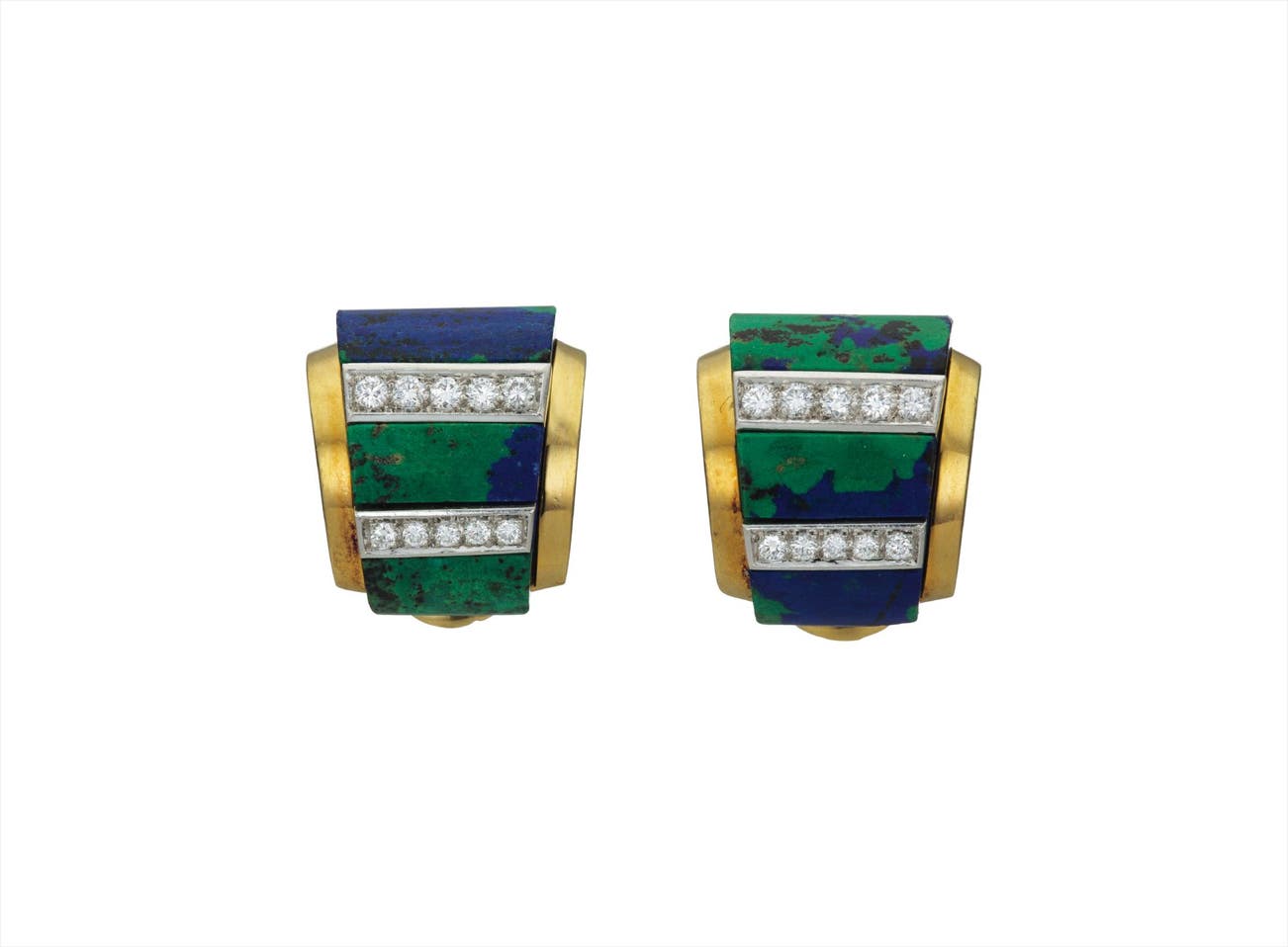 A Pair of Diamond, Gold and Azurmalachite Earclips