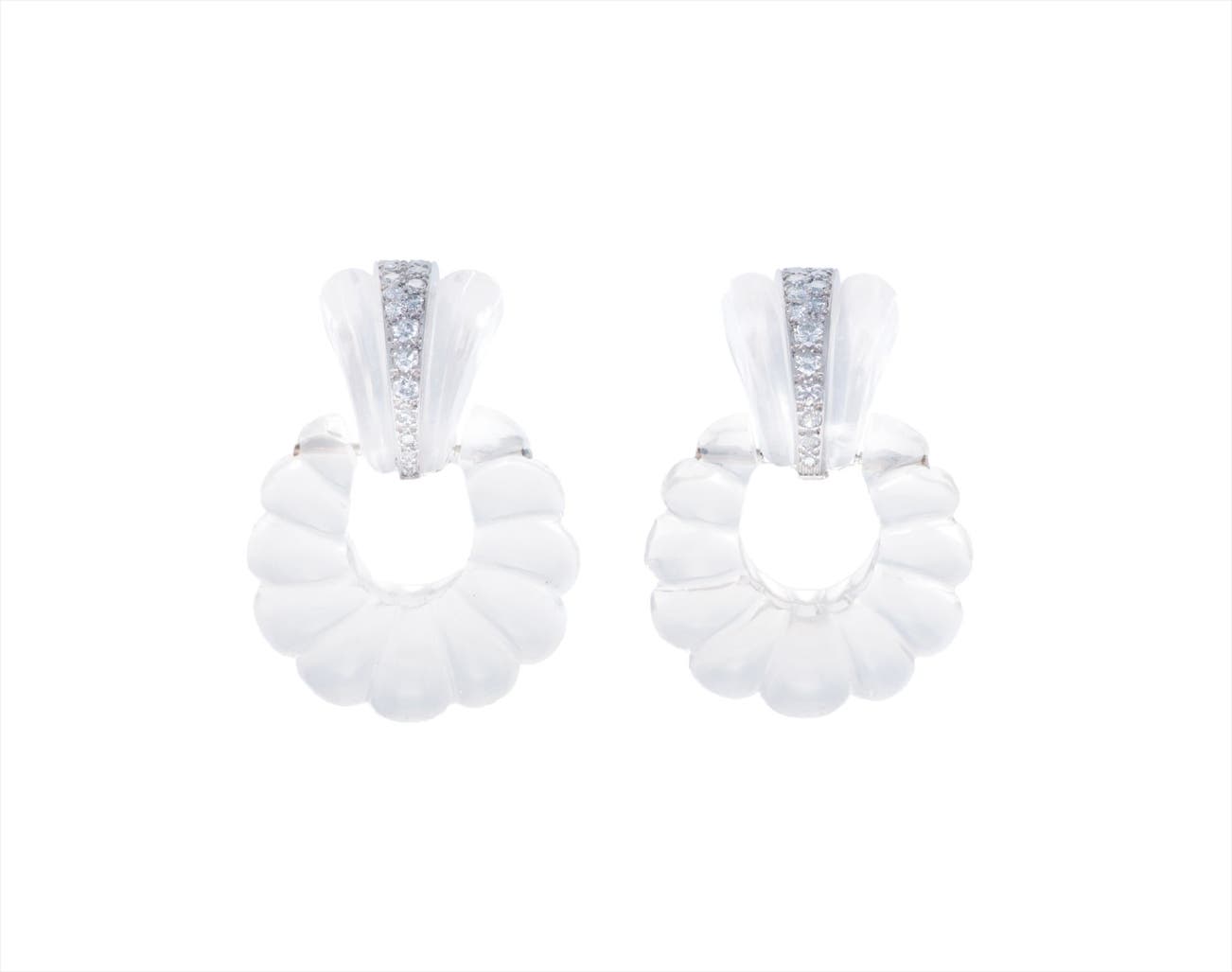 Of bombé design, each suspending a scalloped rock crystal hoop, to the tapered rock crystal surmount, enhanced by a line of graduated circular-cut diamonds, mounted in platinum, length 1 1/2 inches.