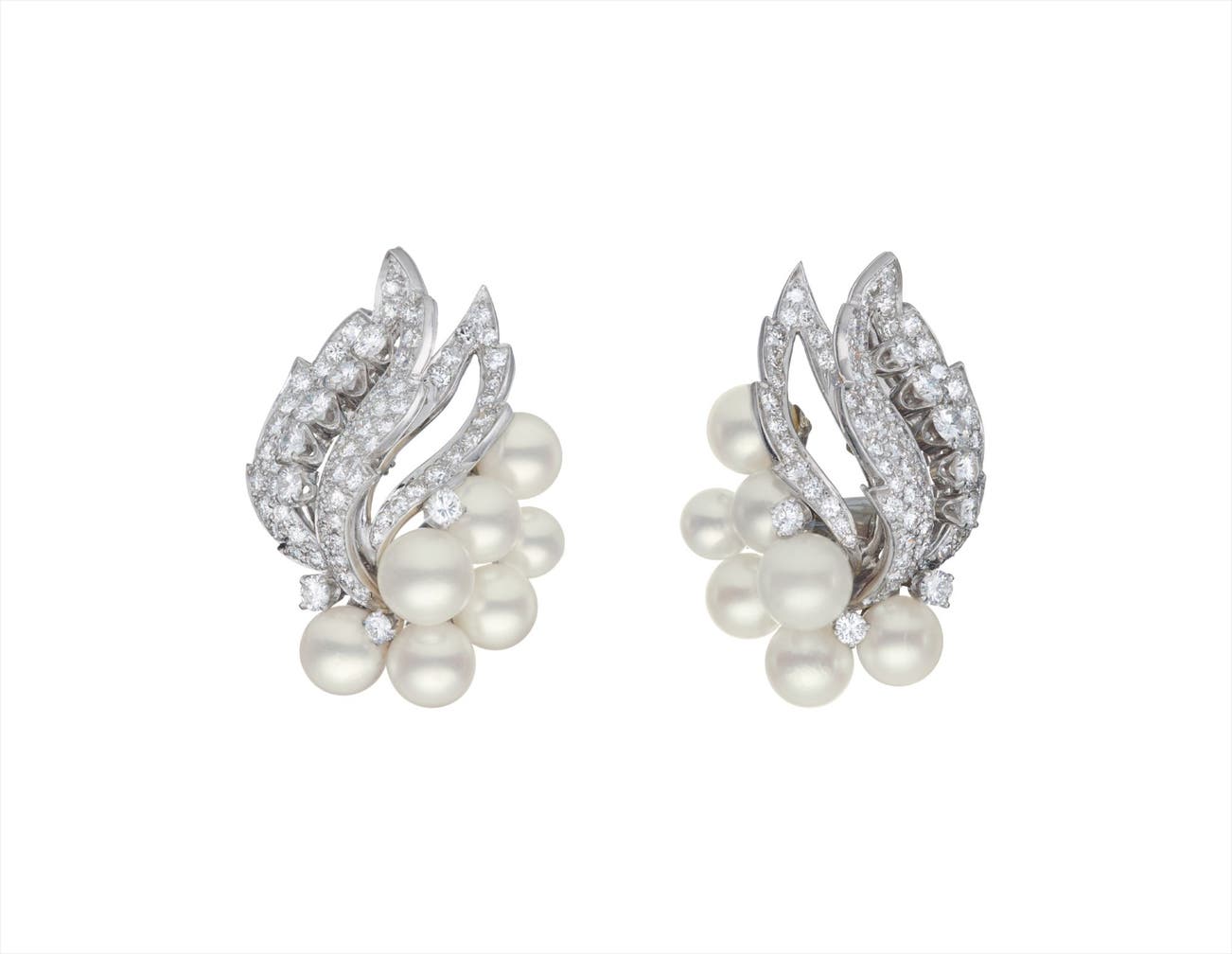 Each of foliate design, the sculpted double leaf set with circular-cut diamonds, to the cluster of cultured pearls, mounted in 18K white gold, length 1 1/2 inches.