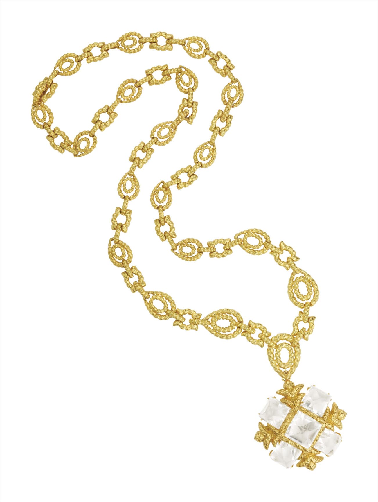 Designed as a long chain necklace of textured gold rope-twist links, suspending a textured gold plaque set with sugarloaf cabochon rock crystals, mounted in 18K yellow gold, chain length 35 inches, pendant length 2 1/2 inches, necklace extenders can be worn as two 7 1/2 inch bracelets.