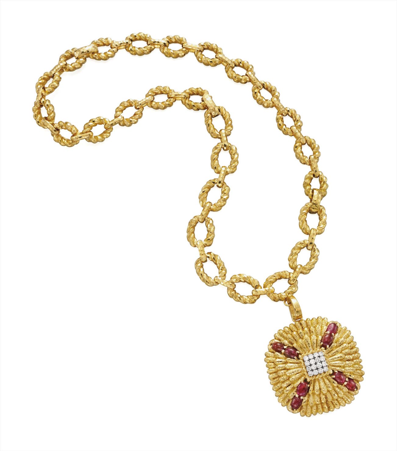 Designed as a long chain necklace of textured gold rope-twist links, suspending a textured gold plaque set with cabochon rubies, centering upon a square motif of circular-cut diamonds, mounted in 18K yellow gold, chain length 25 inches, pendant can also be worn as a brooch, length 3 inches, necklace extender can be worn as a 7 1/2 inch bracelet.