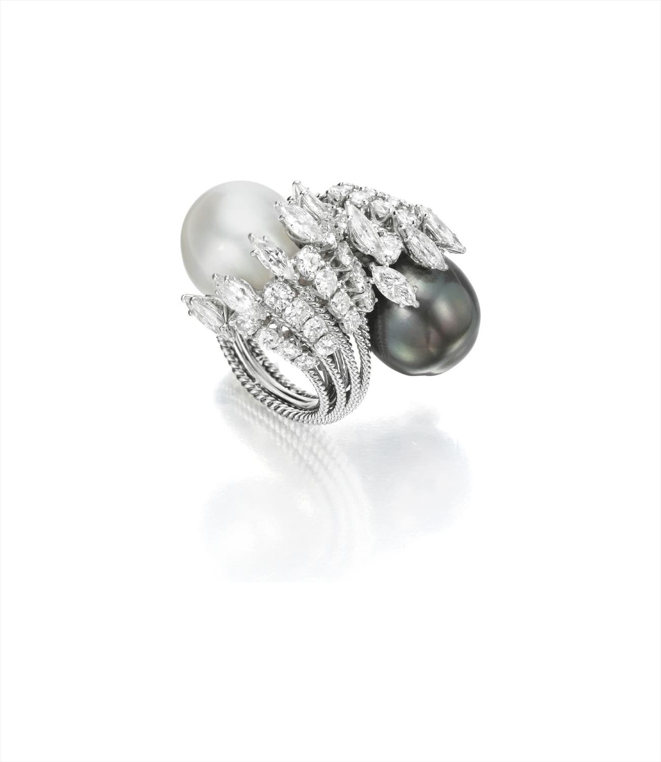 Of cross-over design, the terminals set with a South Sea or Tahitian cultured pearl, to the marquise and circular-cut diamond clusters and the open rope-twist hoop, mounted in platinum and 14K white gold, size 5.