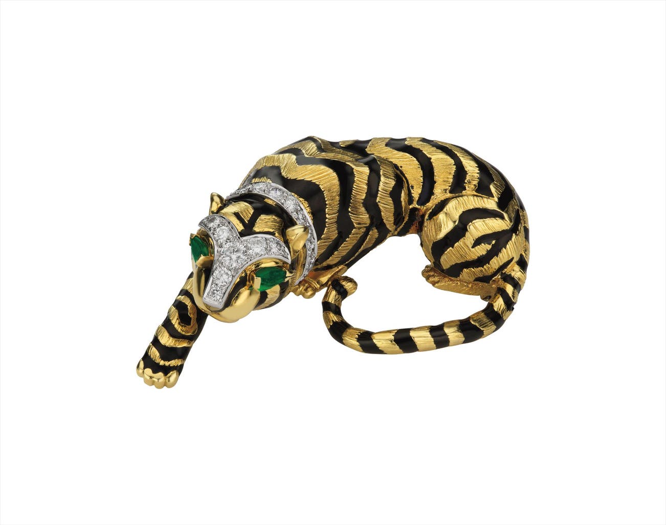 Designed as a textured gold tiger enhanced by black enamel stripes, to the collar and face accented by circular-cut diamonds and eyes set with pear-shape emeralds, mounted in 18K yellow gold and platinum, length 1 1/2 inches.