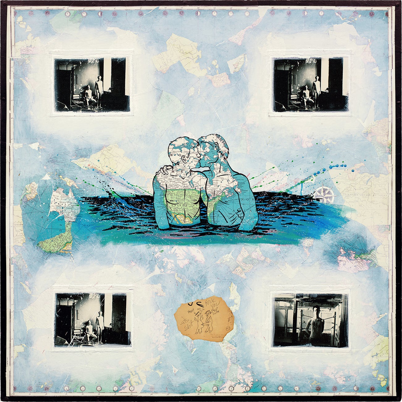 collage, acrylic and four black-and-white photographs on Masonite