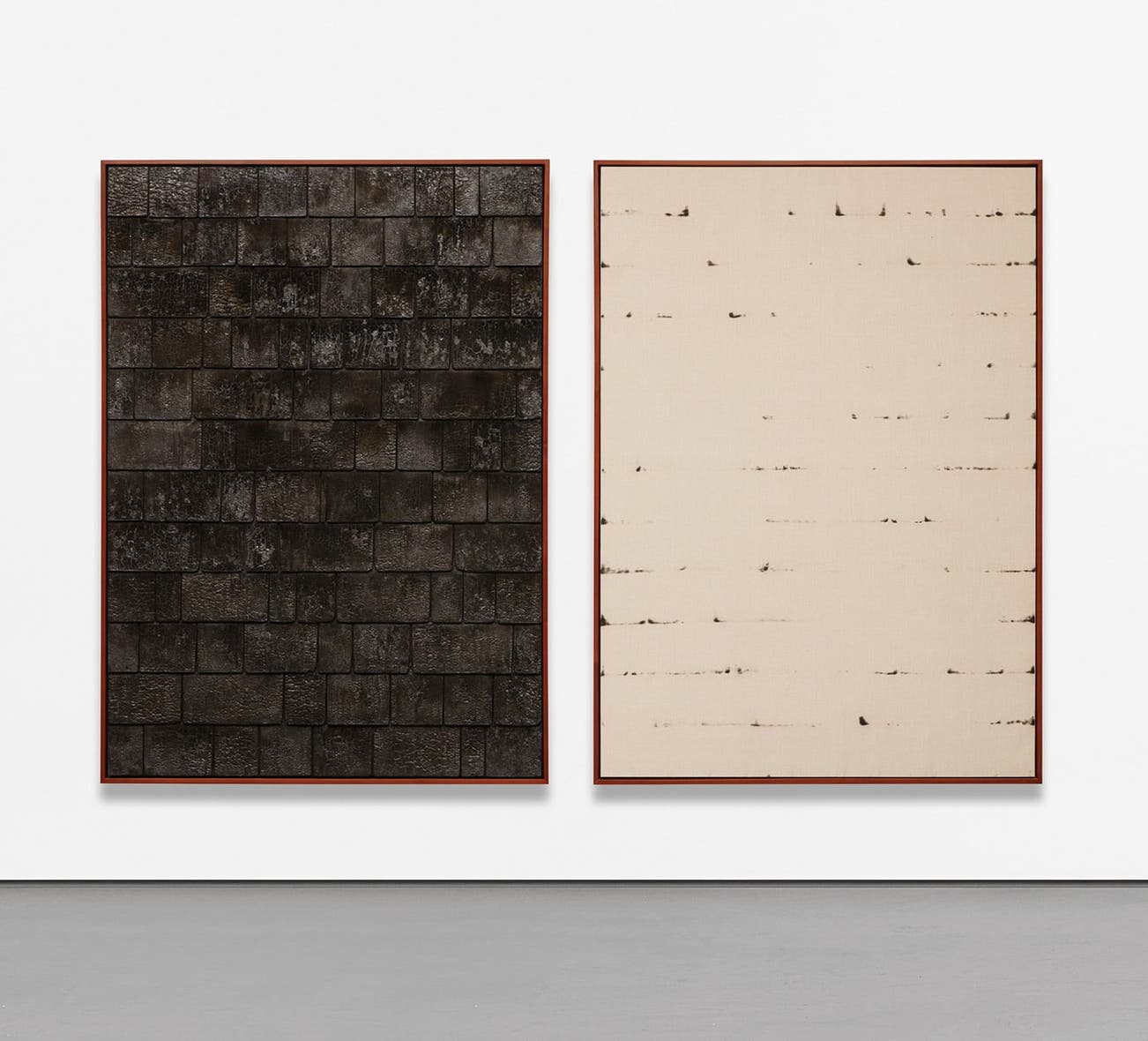 charred wood and dust of charred wood on canvas, in artist's frame, diptych