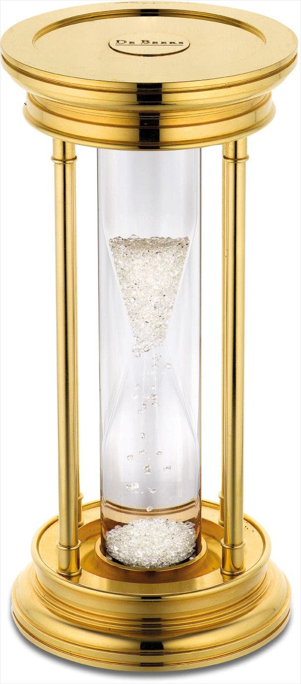 With utmost brilliance, the present 24k gold plated brass and diamond-set hour glass timer sparkles with over 2000 natural rough cut diamonds that weigh approximately 36 carats in total. The diamonds are suspended in a silicone fluid with a 10 minute interval. The hourglass is complete with a self-illuminating stand that highlights the diamonds iridescence. The present hourglass is a special edition for Japan and is numbered 1012 of a limited edition of 2000 pieces only.