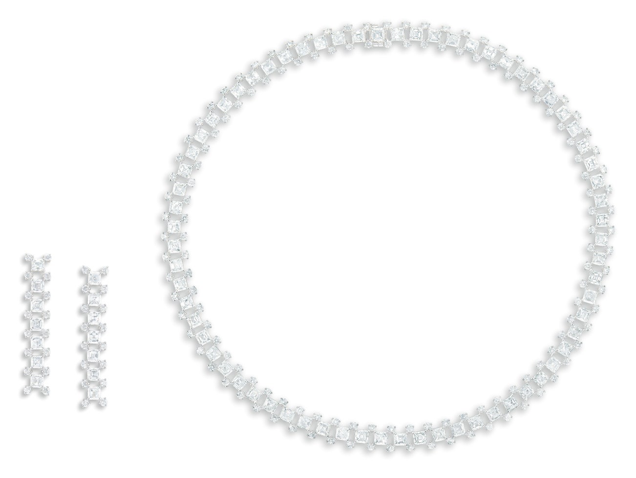 (Necklace) Brilliant- and step-cut diamonds, together approximately 25.40 carats(Earrings) Brilliant- and step-cut diamonds, altogether approximately 5.50 carats18 karat white goldEarrings signed <em>De Beers </em>and numbered <em>A03795</em>; necklace stamped <em>DB for De Beers</em> and numbered <em>DB0312.</em>