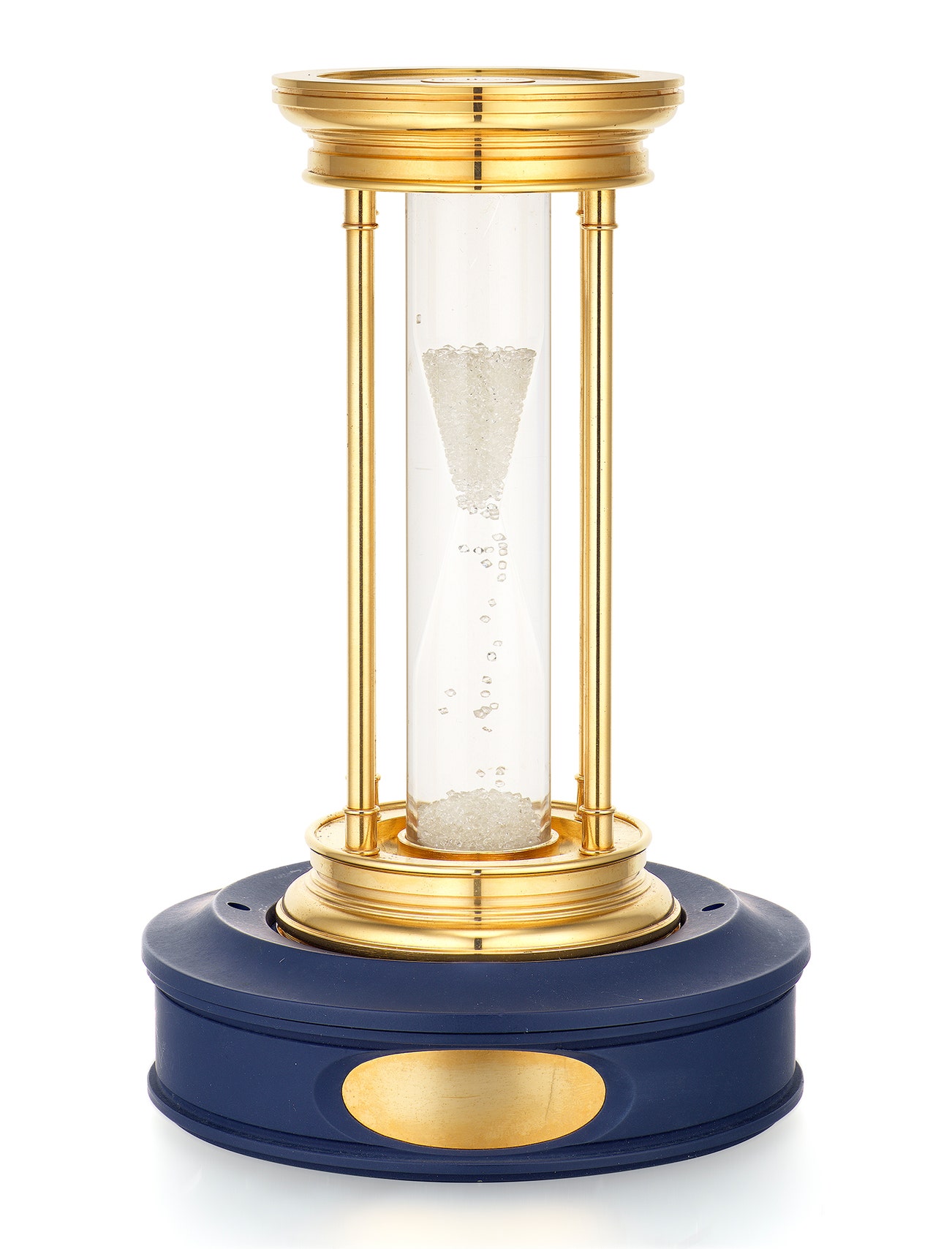An hourglass with floating diamonds, mounted in gilt brass, case signed De Beers and Citizen, diameter approximately 70 mm, height approximately 148 mm.
