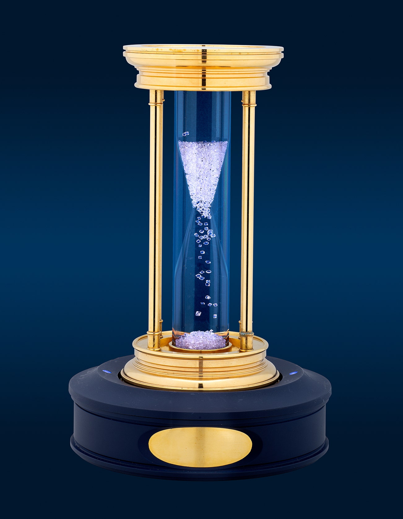 A fine and attractive gold-plated brass and diamond-filled hourglass timer with illuminated stand and presentation box