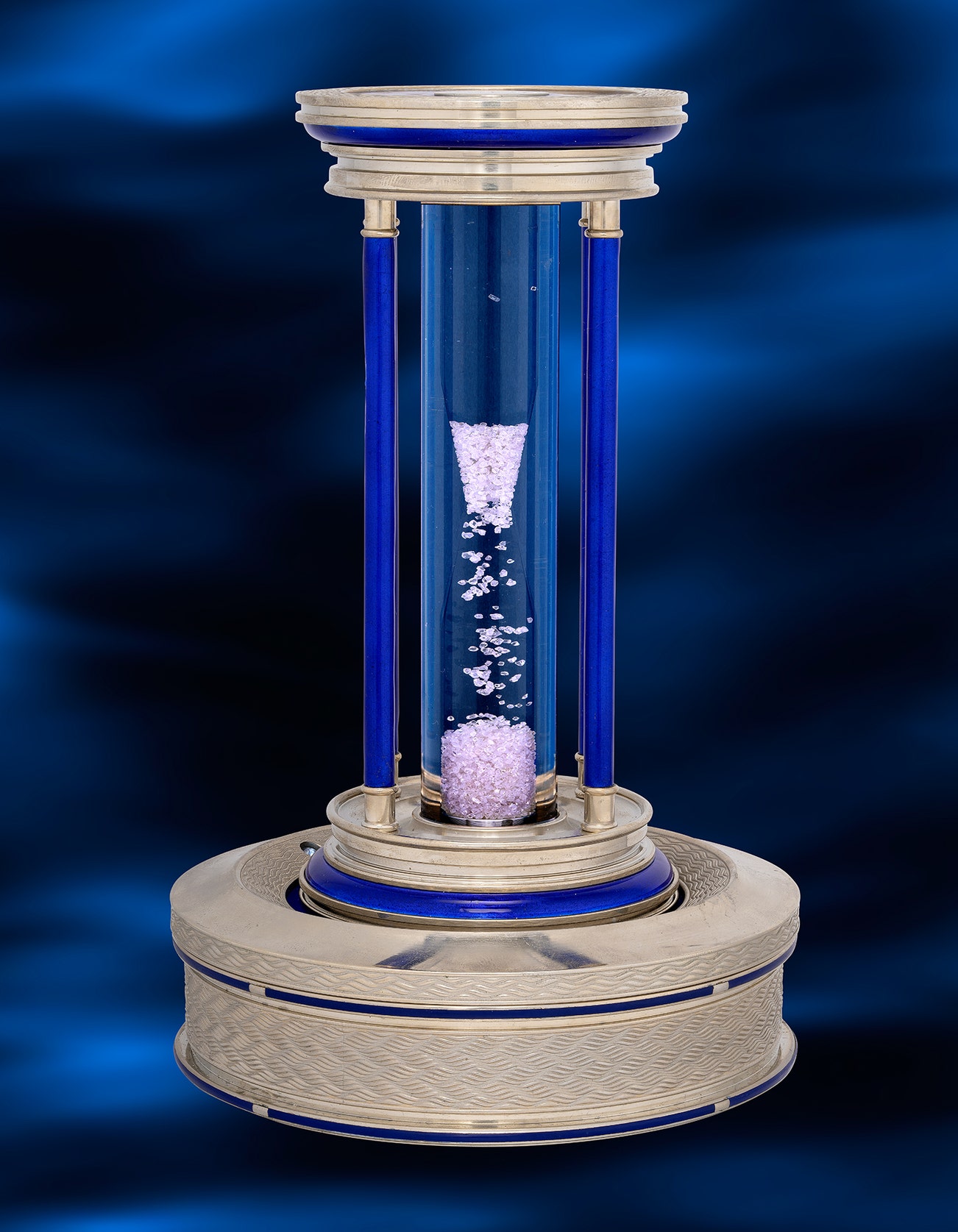 - The present example is a limited edition of 500 pieces, featuring a silver case and an illuminated stand adorned with delicate engravings and exquisite blue enamel. The hourglass contains over 2,000 loose diamonds, measuring a 10-minute interval. It is sure to evoke immense delight as one watches the shimmering diamonds float gracefully through the hourglass, illuminated by the blue light.