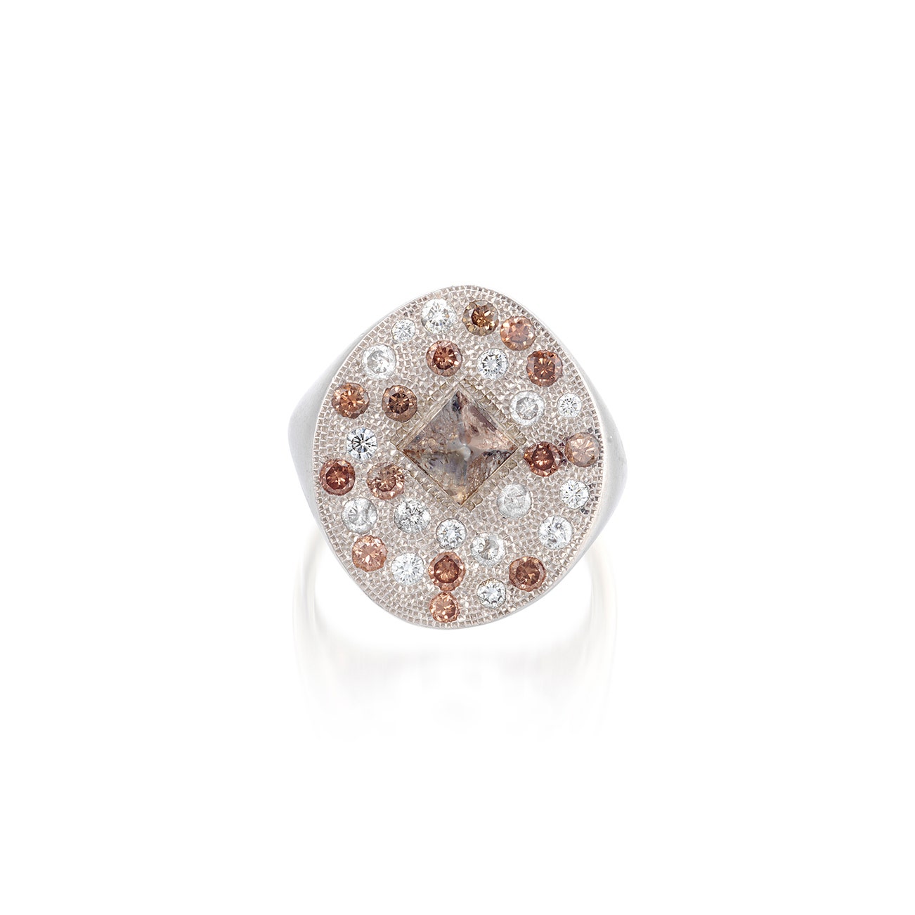 Centring upon a rough diamond of brown tint, surrounded with brilliant-cut diamonds and brilliant-cut diamonds of brown tint, mounted in white gold, size 3½, case stamped De Beers.