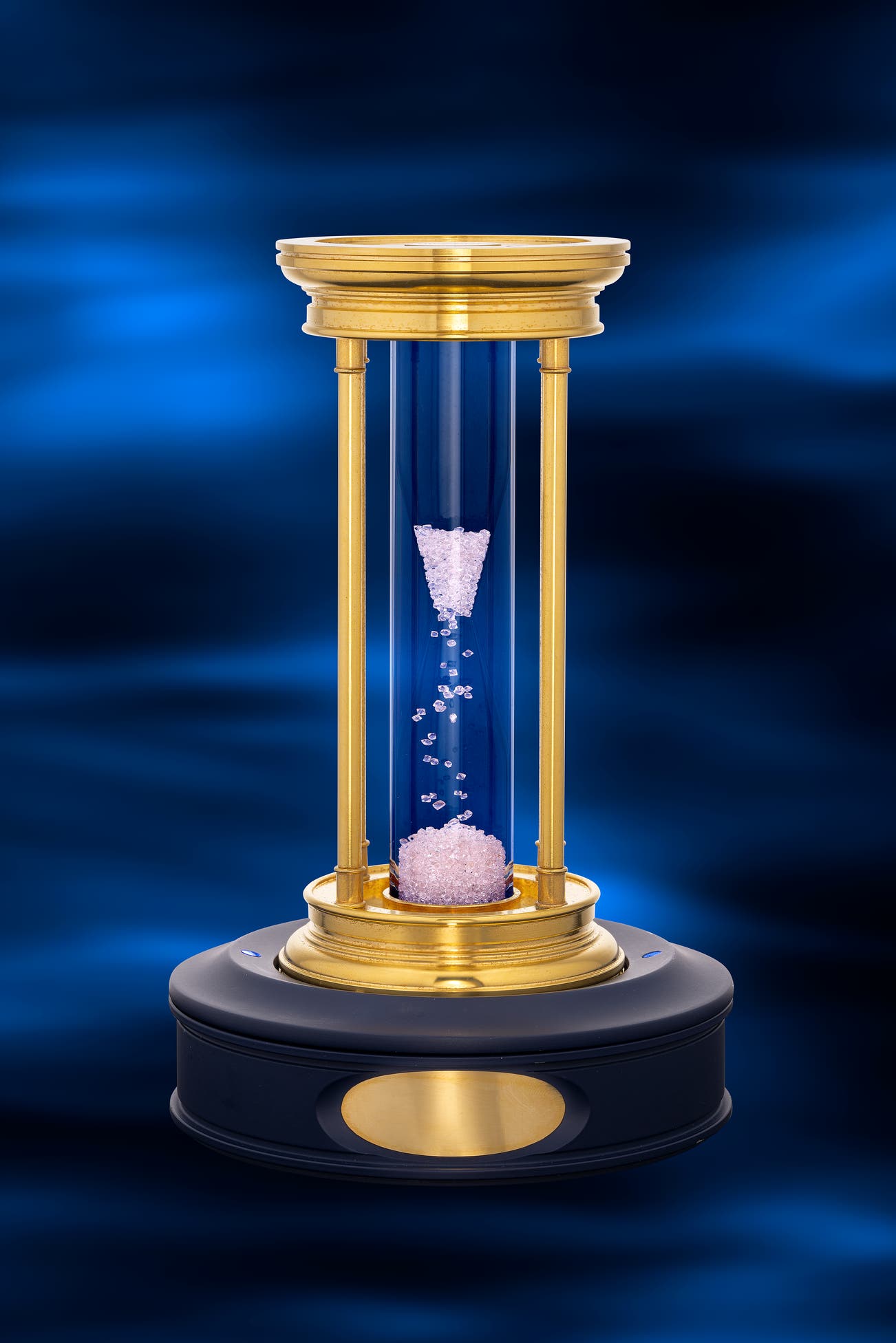 A fine and attractive gold-plated brass and diamond-filled hourglass timer with illuminated stand and presentation box