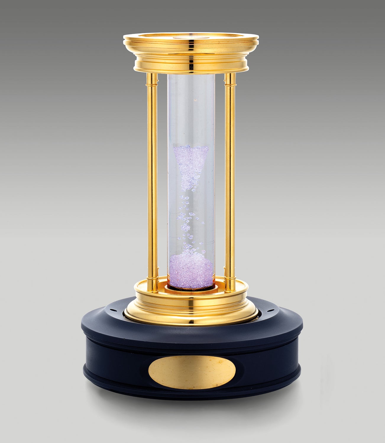 A fine and attractive gold-plated brass and diamond-filled hour glass timer with illuminated stand and presentation box