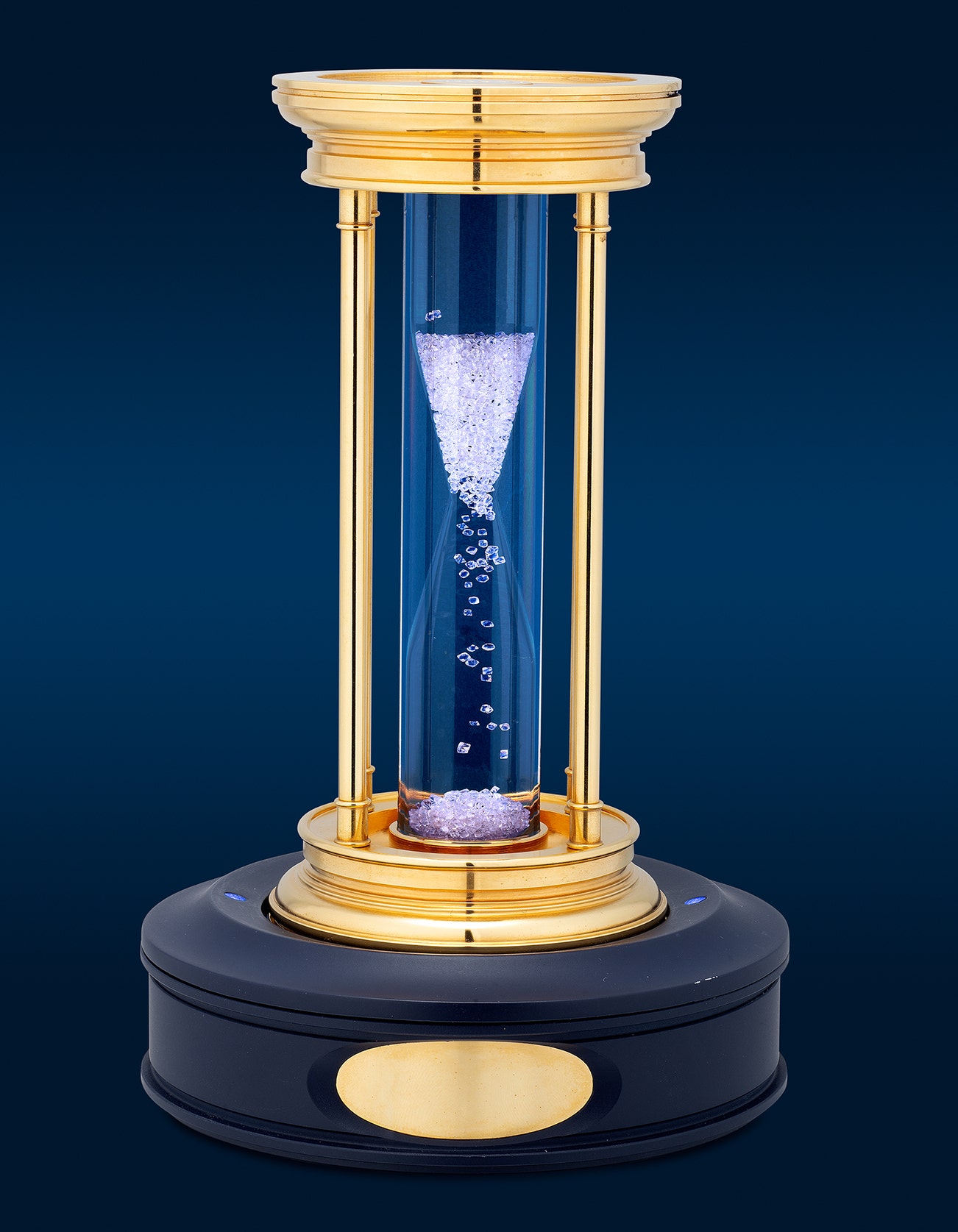 A fine and attractive gold-plated brass and diamond-filled hourglass timer with illuminated stand and presentation box