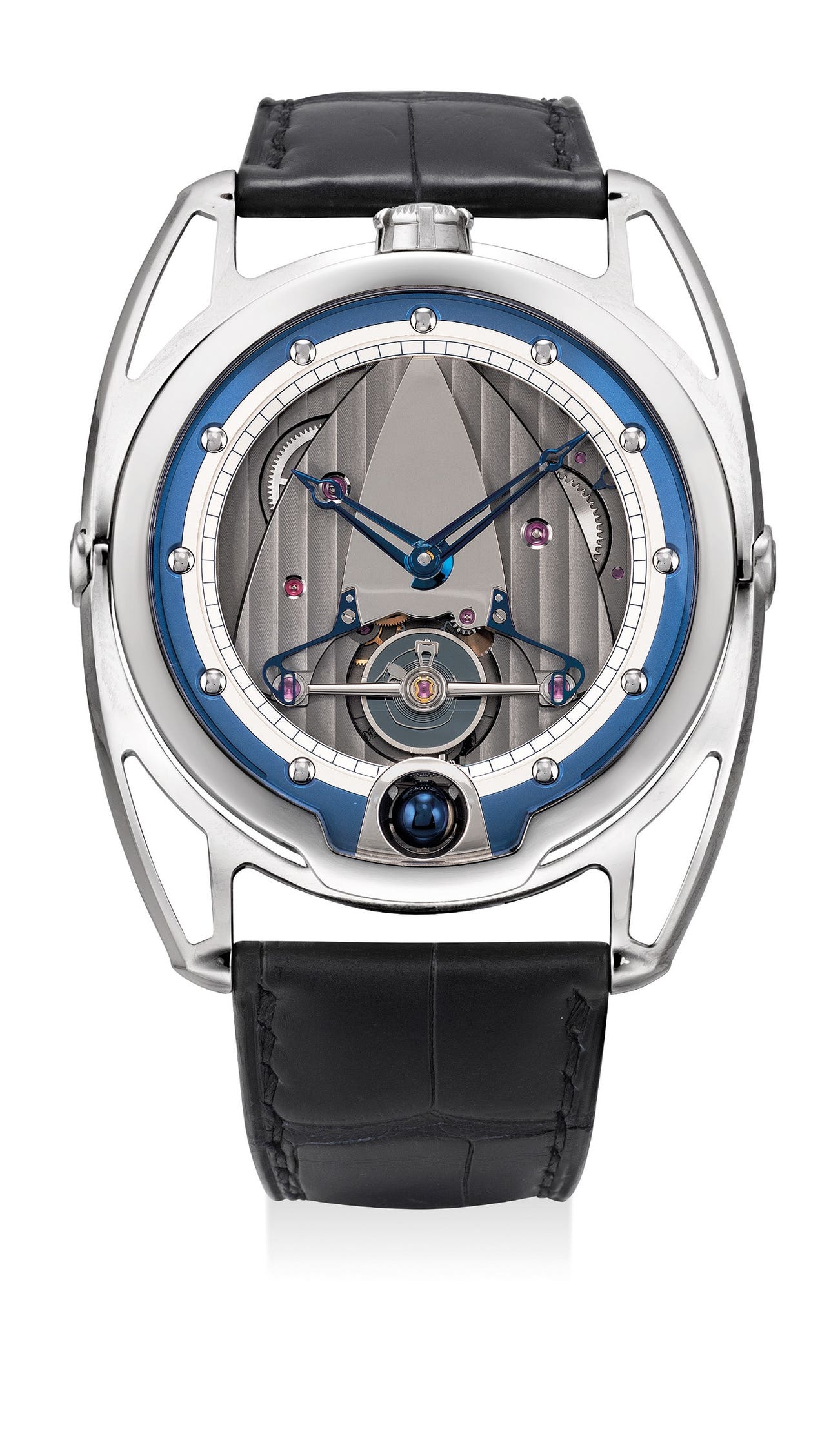 Markedly futuristic in their design, many are the telltale features of De Bethune timepieces. The most apparent is the “floating lugs”, that is: hinged lugs anchored to the centre (at 9 and 3 o’clock) of the case, allowing for a remarkably comfortable wearing experience. Another feature that by now is indissolubly linked with the brand is their 3D moon phase display, realised with a half-blackened metal ball, allowing for a truly innovative take on a complication which had remained more or less unchanged since its inception centuries ago.