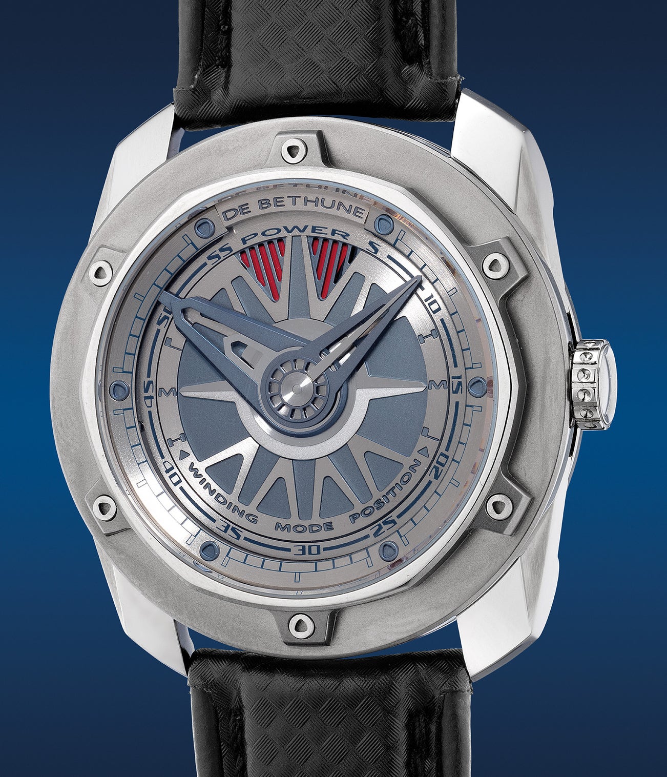 The De Bethune DB24 Big Power Super Sport is built for action with precise regulated winding functionality that gives its wearer full control. Ingenuous and innovative at the same time, the DB24 is equipped with a variable inertia winding system that enables adjustment of the speed ratios of the rotor based on the movement generated by the wearer’s wrist action. Its purpose, by means of a lever actuated via the winding crown alters the mode of activity. Indicated on both the periphery on the dial and on the back of the movement with three level of intensity, H M and L, the wearer can set the timepiece to H for sport mode to avoid any surges of the rewinding spring, M for normal everyday wear, or L for slow to ensure minimum winding is sufficient to maintain regulating performance.