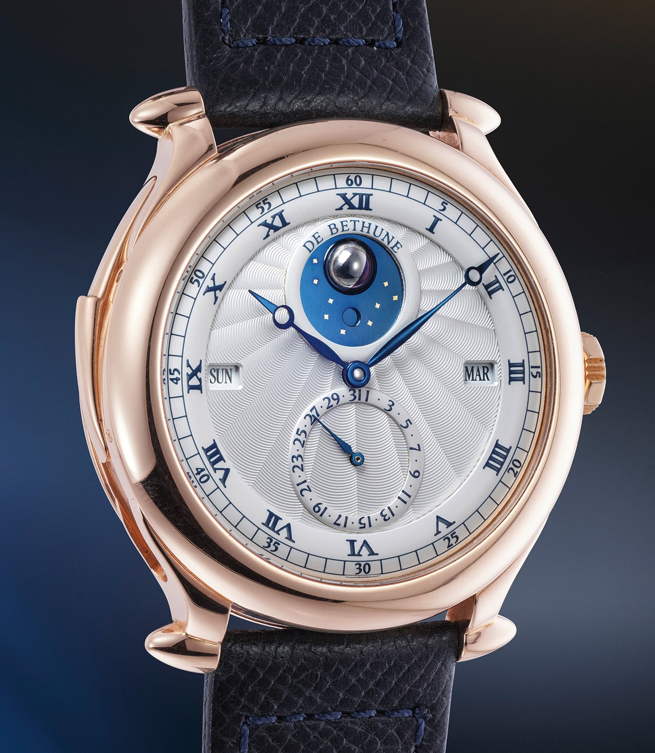 The present unique timepiece is somewhat of a transitional piece from 2005, and a model that enabled Denis Flageollet to define the aesthetics of the future DB17 with the typical "bullet" and the brand's signature spherical moonphase. The movement - based on a Claret ebauche but with a De Bethune balance - remains more traditional even though a breathtaking perpetual calendar, minute repeating, tourbillon movement exquisitly finished is far from being "traditional" and a feat of technical and watchmaking engineering.